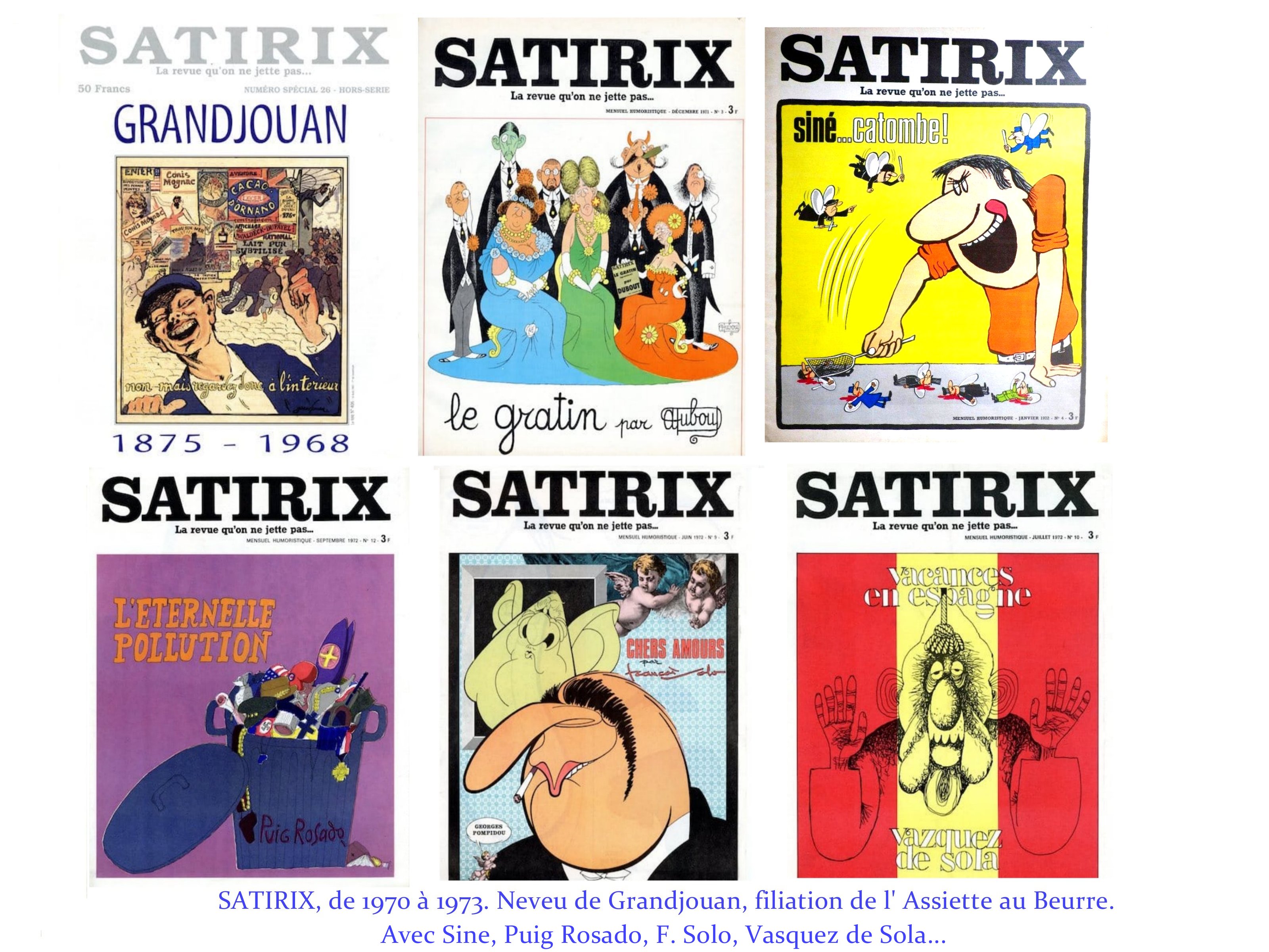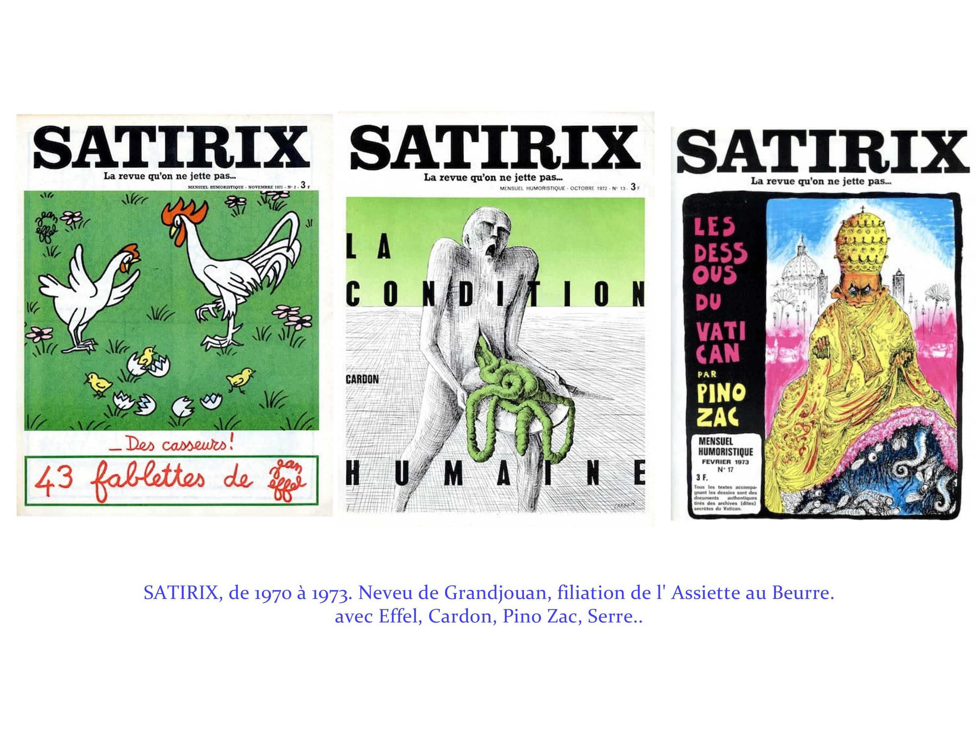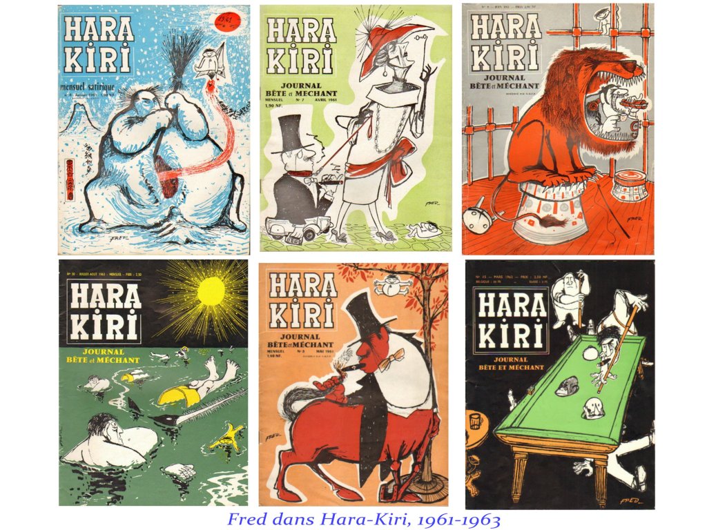 A noter les débuts très sages de Hara Kiri, qui sous la houlette de Fred ( l’auteur des voyages de Philémon), développe une légère et poétique misanthropie. Il faut attendre 1968 pour voir se libérer la rage vitale des Cabu, Reiser, Wolinsky.