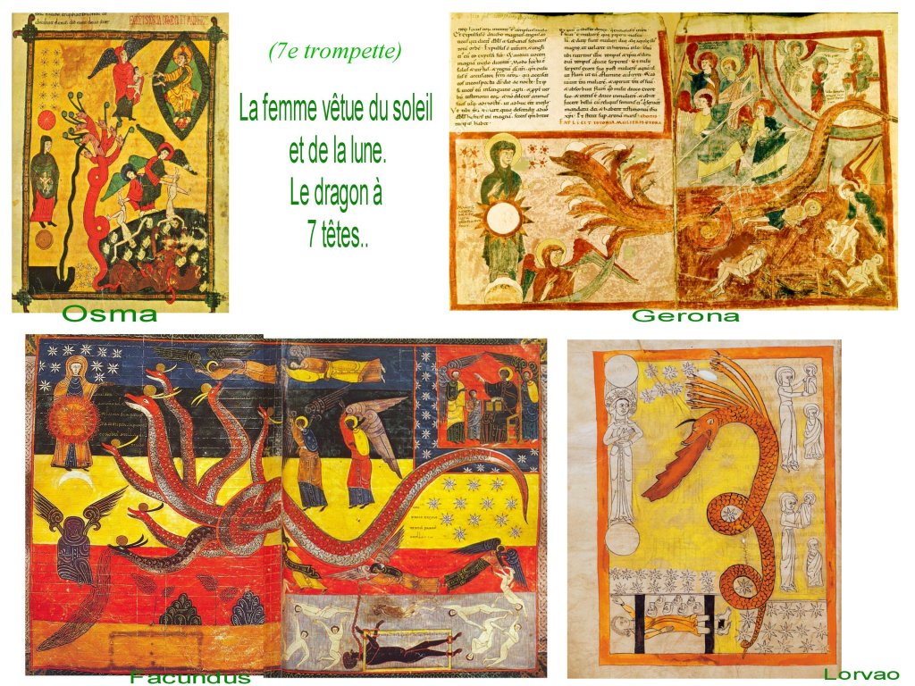 On trouve dans les Beatus asturiensBeatus de Liebana-Apocalypses, la condamnation de la « prostituée de Babylone », qui à l’évidence représente les cultures « babyloniennes » et anatoliennes de Ishtar, mais encore Artemis d’ Ephèse Artemis d’ Éphèse, gorgones, amazones..( St Jean écrit son apocalypse à Pathmos, St Paul prêche à Ephèse), figures maudites d’un pouvoir féminin sur le vivant, honni, aussi bien par les hellènes que par les chrétiens. Les apocalypses figurent encore ces figures de démons et monstres, comme figures d’antéchrists, dont seul l’agneau triompherait.