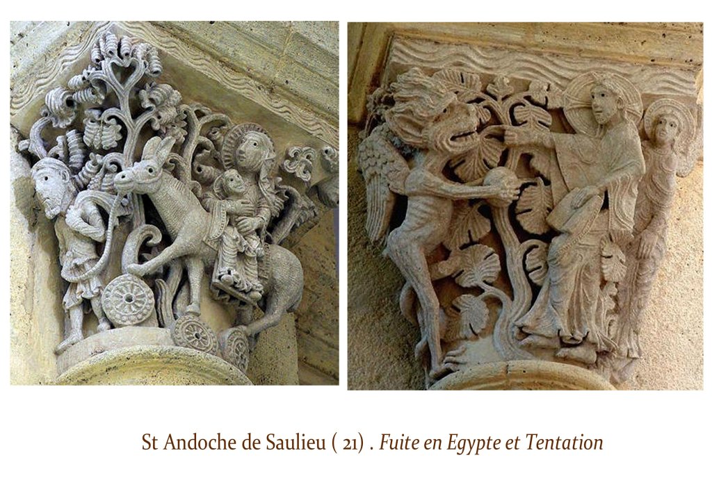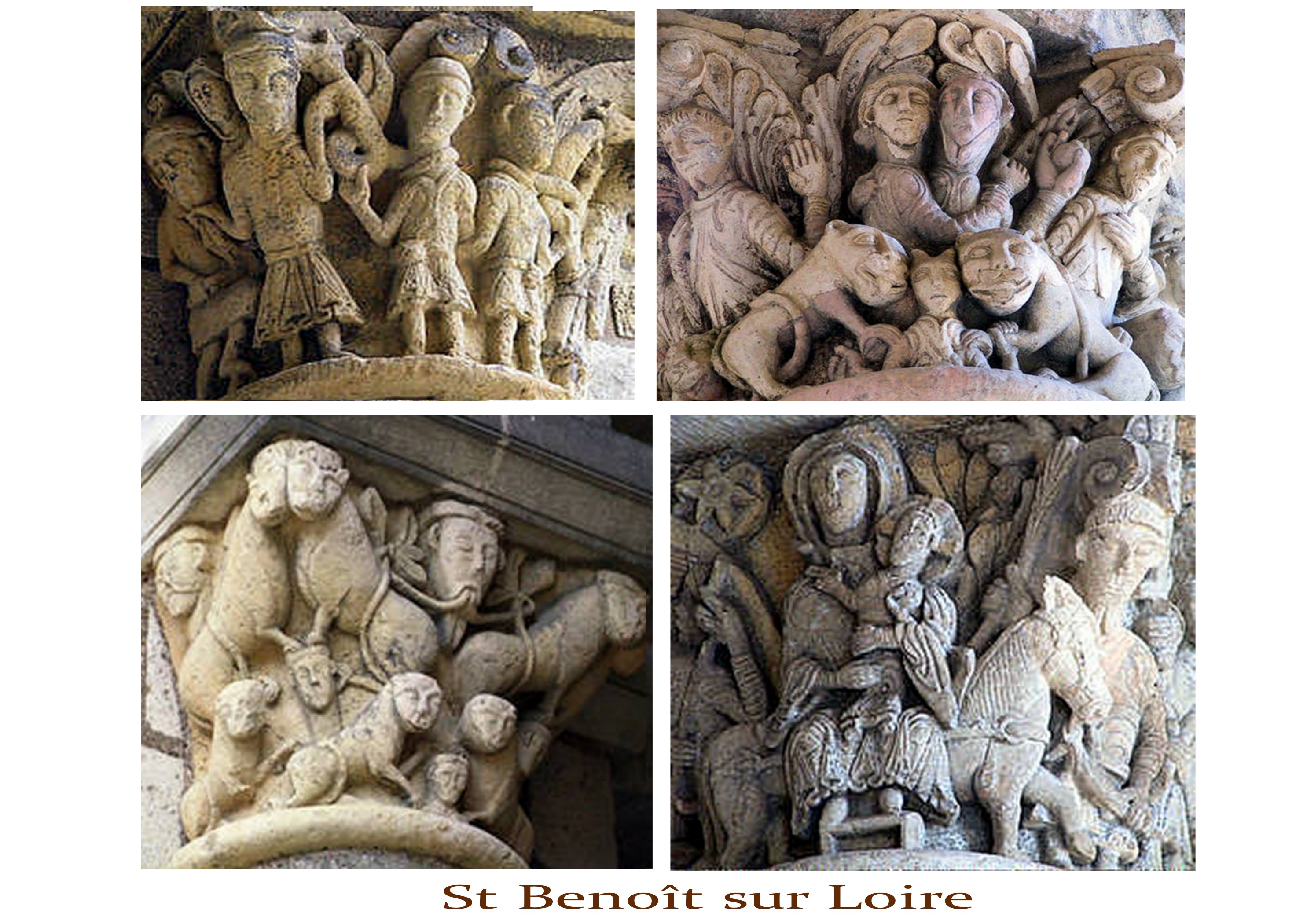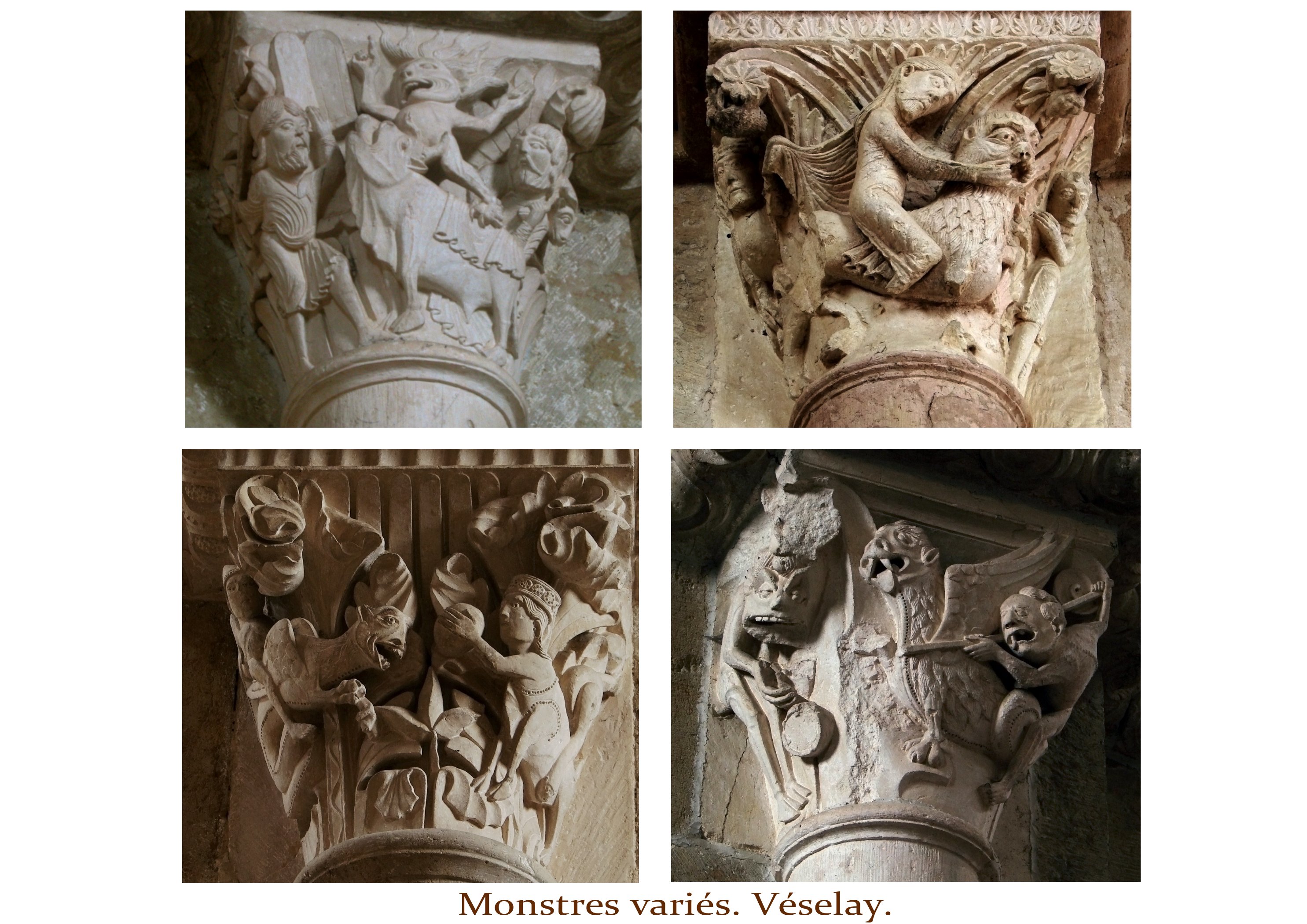 L’apparition de la figure du diable, assez récente (9/10e siècle d’après E. Mâle (op.cit)), est l’occasion de rappeler, que selon la tradition grecque platonicienne, reprise par le christianisme, il faut se défaire de l’animalité humaine, en se dirigeant vers l’esprit, le divin. Les monstres et animaux, rappellent aussi aux humains, leur condition terrestre, de pêcheurs, impurs. Toute cette diversité, réelle et fantasmée, est organisée selon un style « roman » assez homogène,( unifiant les traditions orientales, celtiques, carolingiennes et mozarabes) simplifiant les proportions et expressions, au bénéfices des signes et symboles, reposant sur un graphisme universel de courbes et de droites alternées ( la palmette) et intégrés dans l’édifice unifiant de l’église, en des lieux distincts et signifiants : chapiteaux et tympans, zones de passage de la terre au ciel, du haut en bas, du terrestre au céleste, du monde prosaïque au monde christianisé.VEZELAY- Le chapiteau du moulin mystique.
