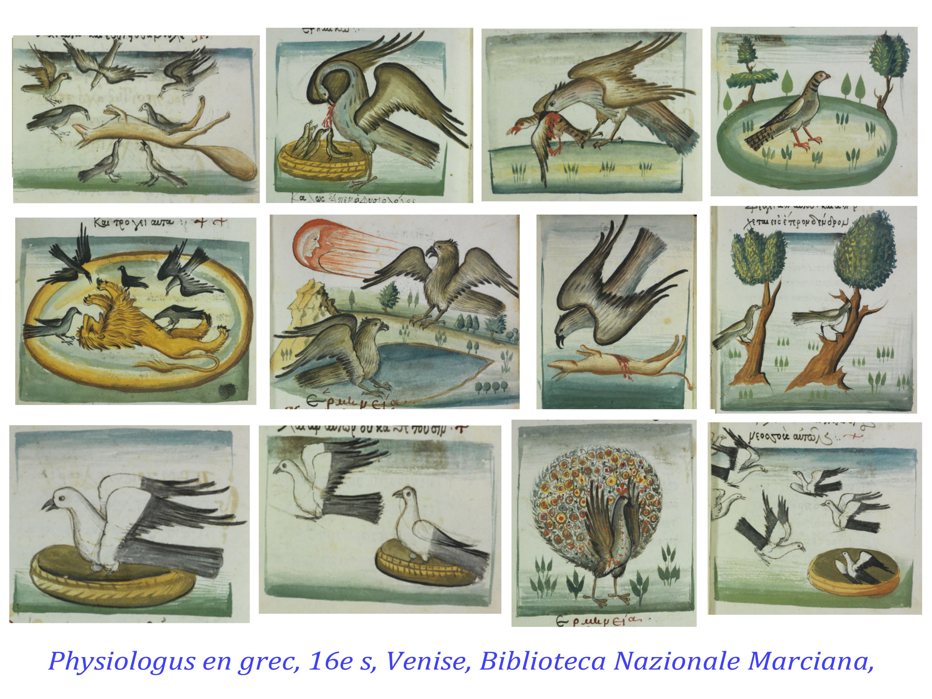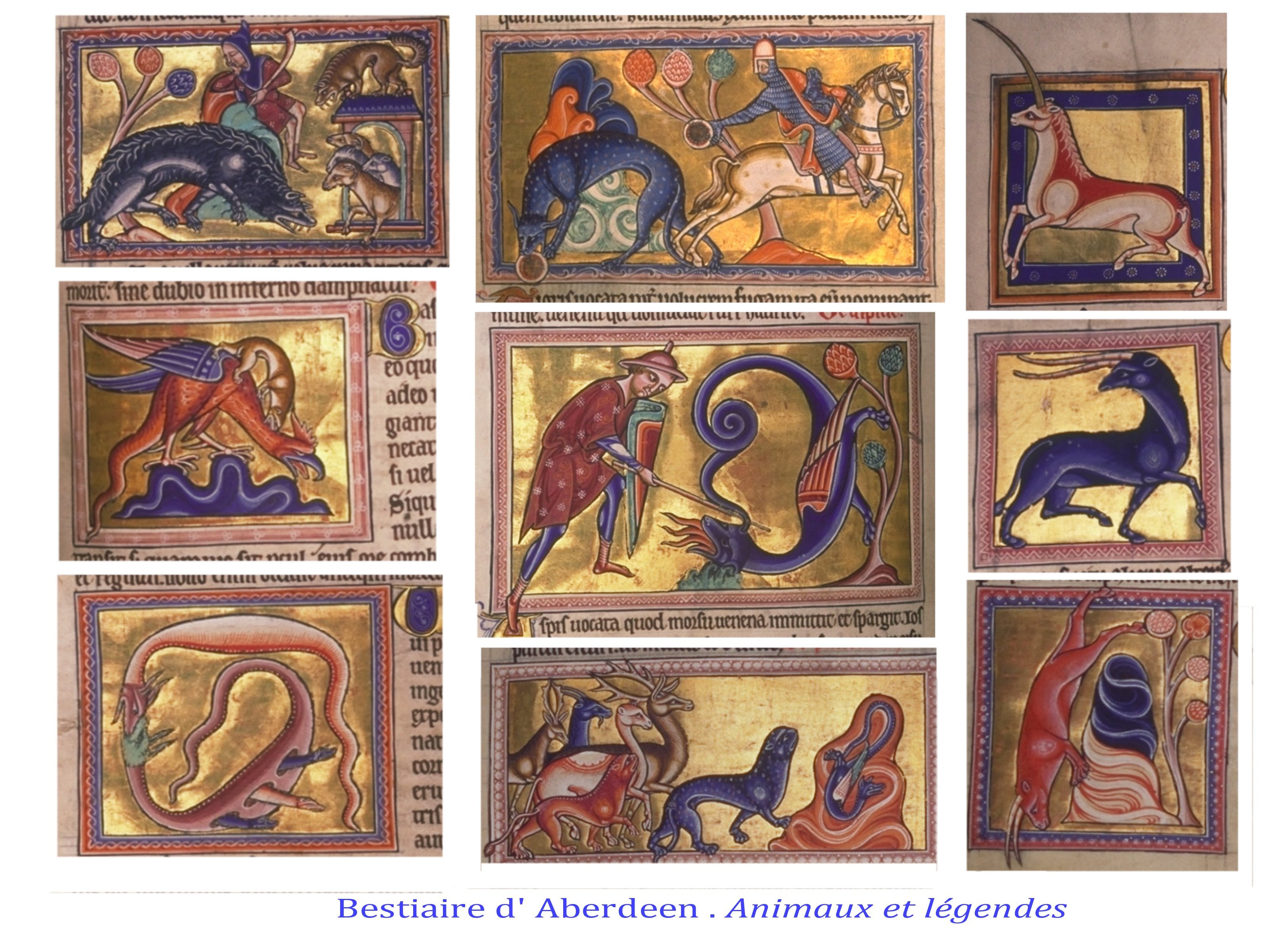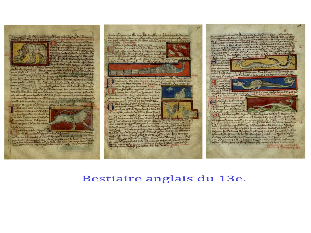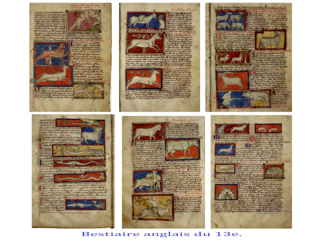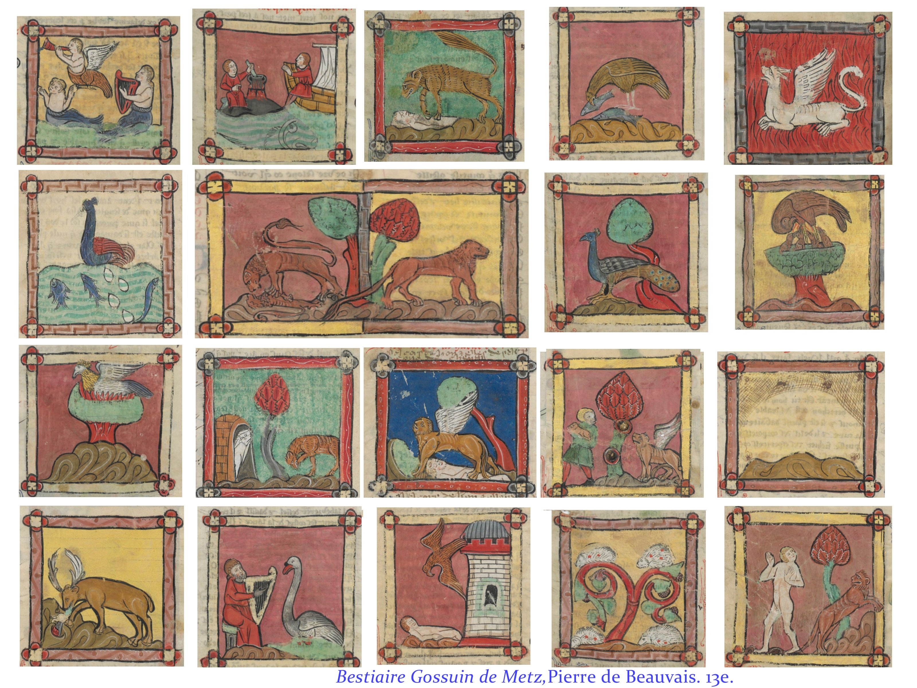 Les bestiaires sont étonnants ; la plupart d’entre-eux reprenant les mêmes textes grecs : le « Nicandre de Colophon » par exemple. On retrouve exactement les mêmes figures et caractéristiques, de la licorne, du Caladrius, du tigre ( attrapé grâce au miroir), de la hyène profanatrice de tombes, au bison pestilentiel, comme le chien fidèle, vengeur et chasseur mais aussi le pélican figure du sacrifice christique ( erreur d’interprétation de la becquée des pélicans – ceux ci écrasant les poissons pêchés dans leur poche de bec, avant de les offrir saignants à leur progéniture- furent compris comme se blessant jusqu’au sang pour offrir leur chair. Sacrifice christique, royal et/ou patriarcal) ; on trouve encore à foison les éléphants d’ Alexandre et Hannibal, machines de guerre représentées de façon peut naturaliste.