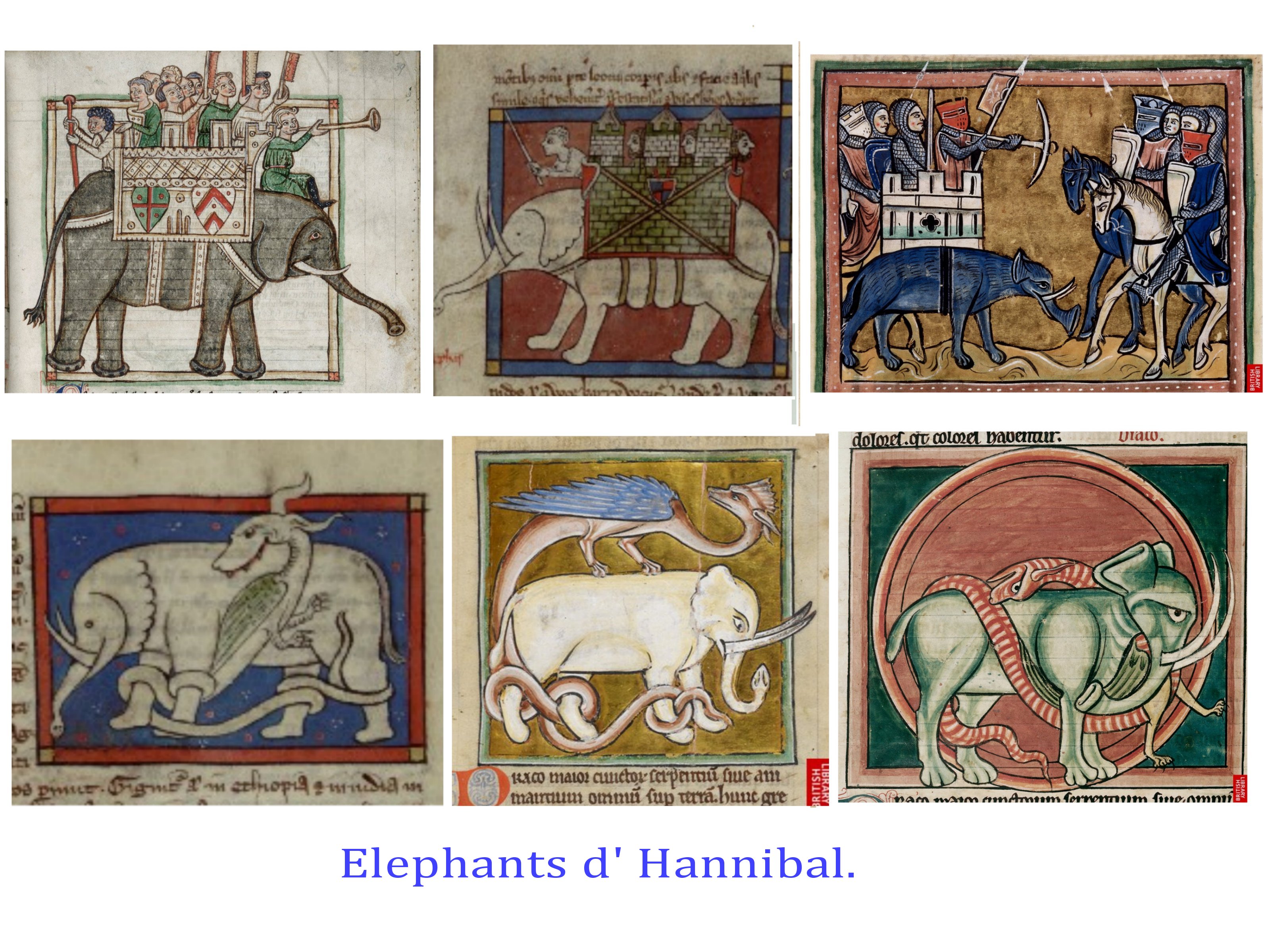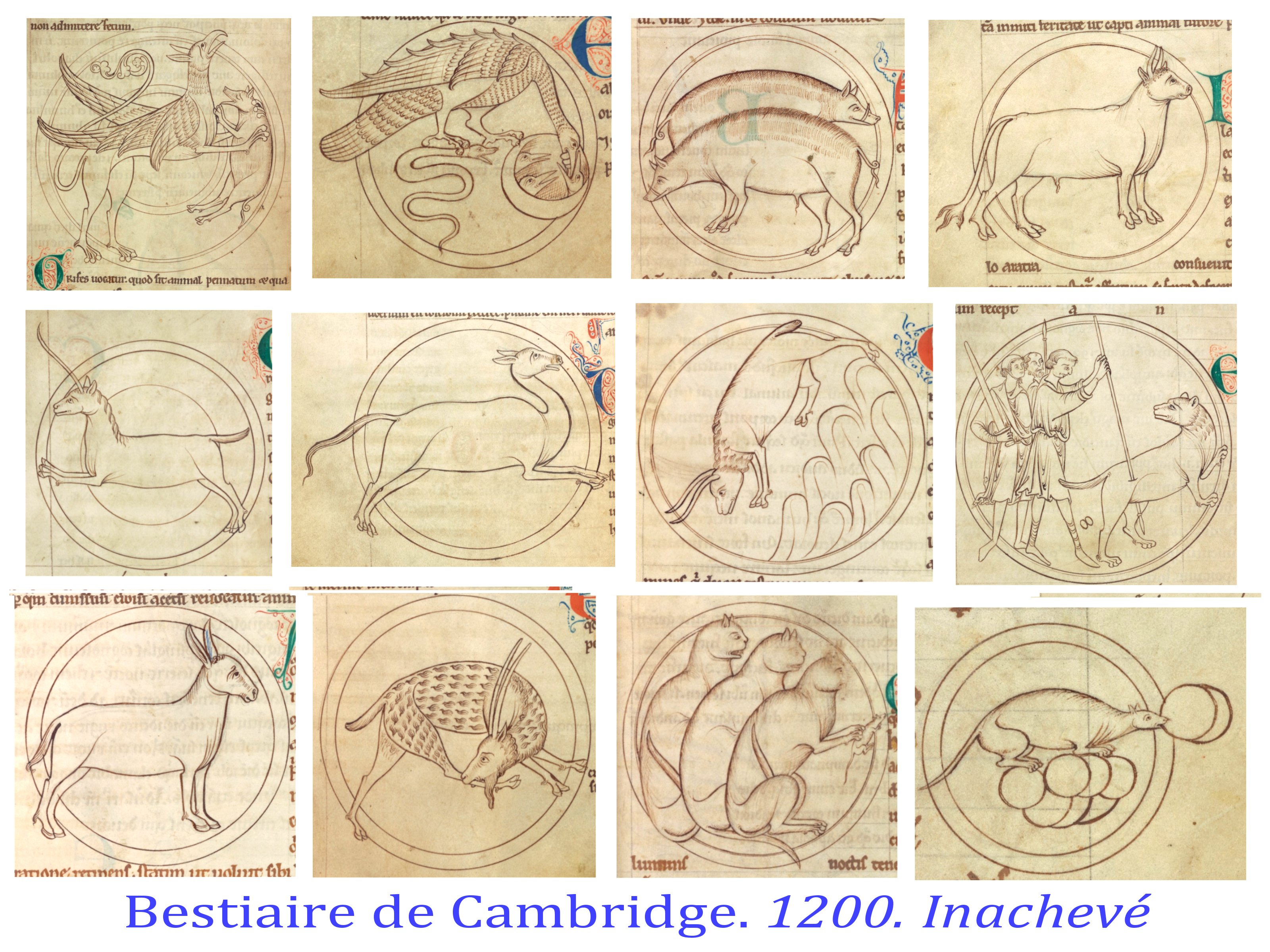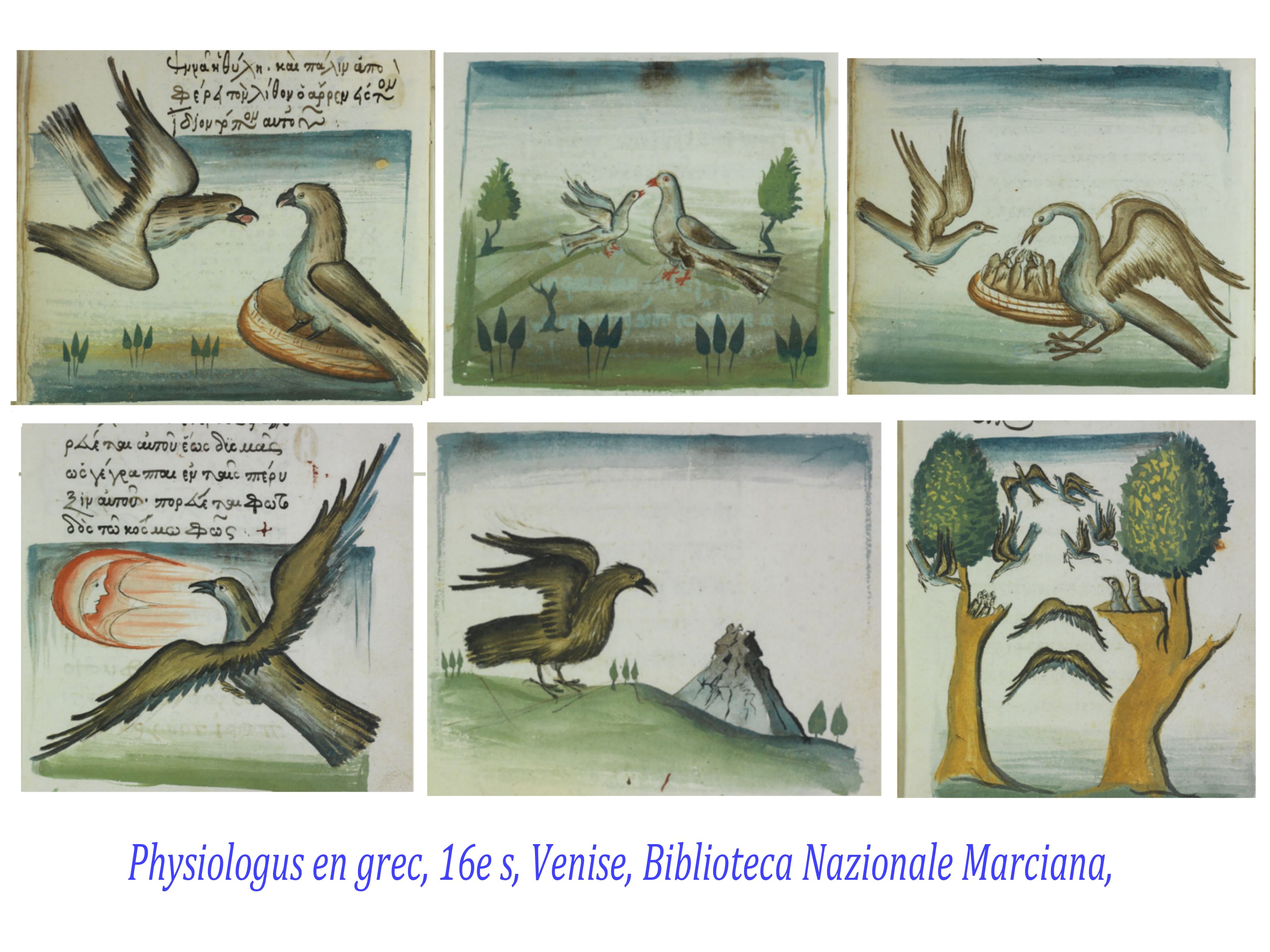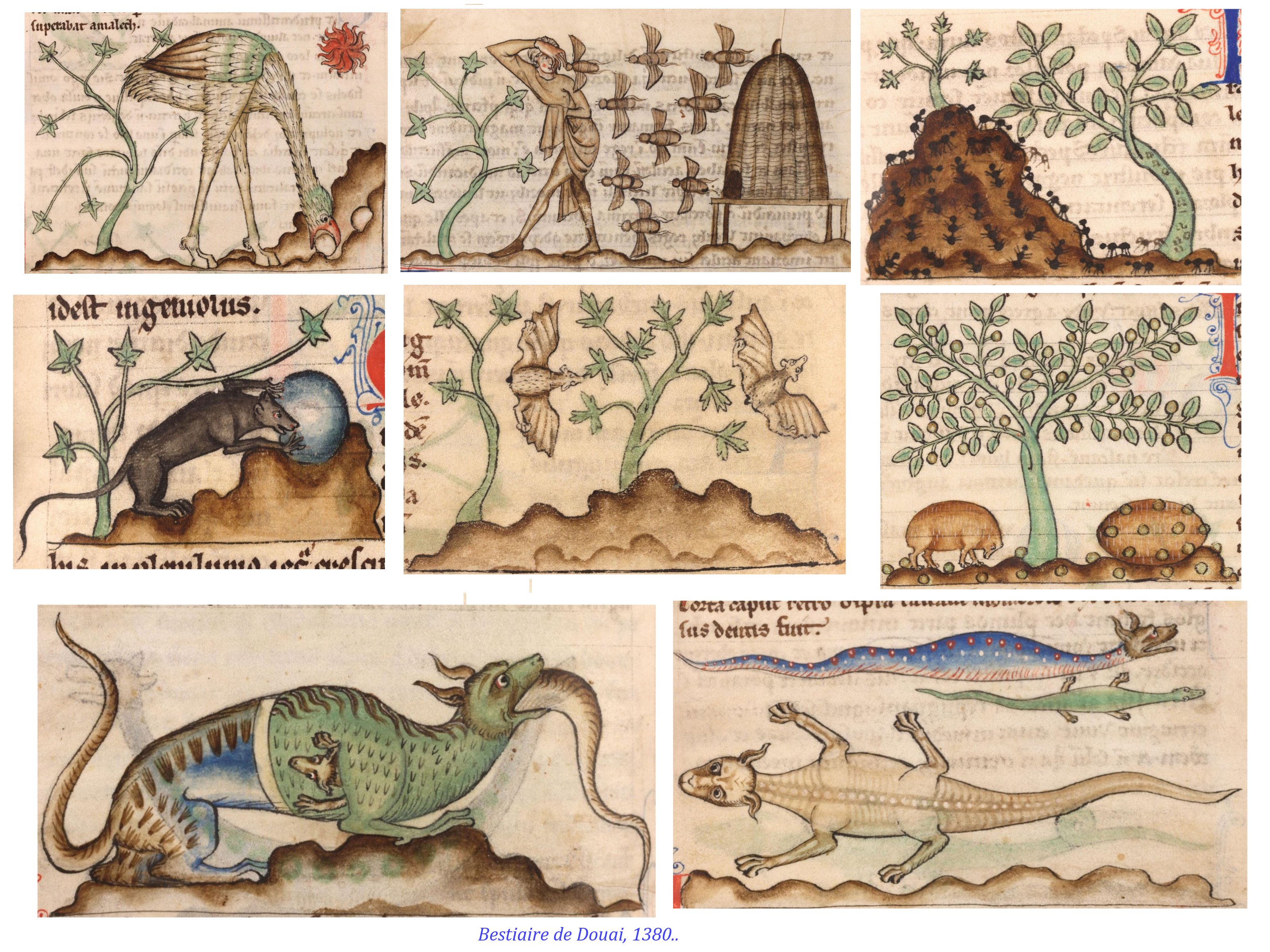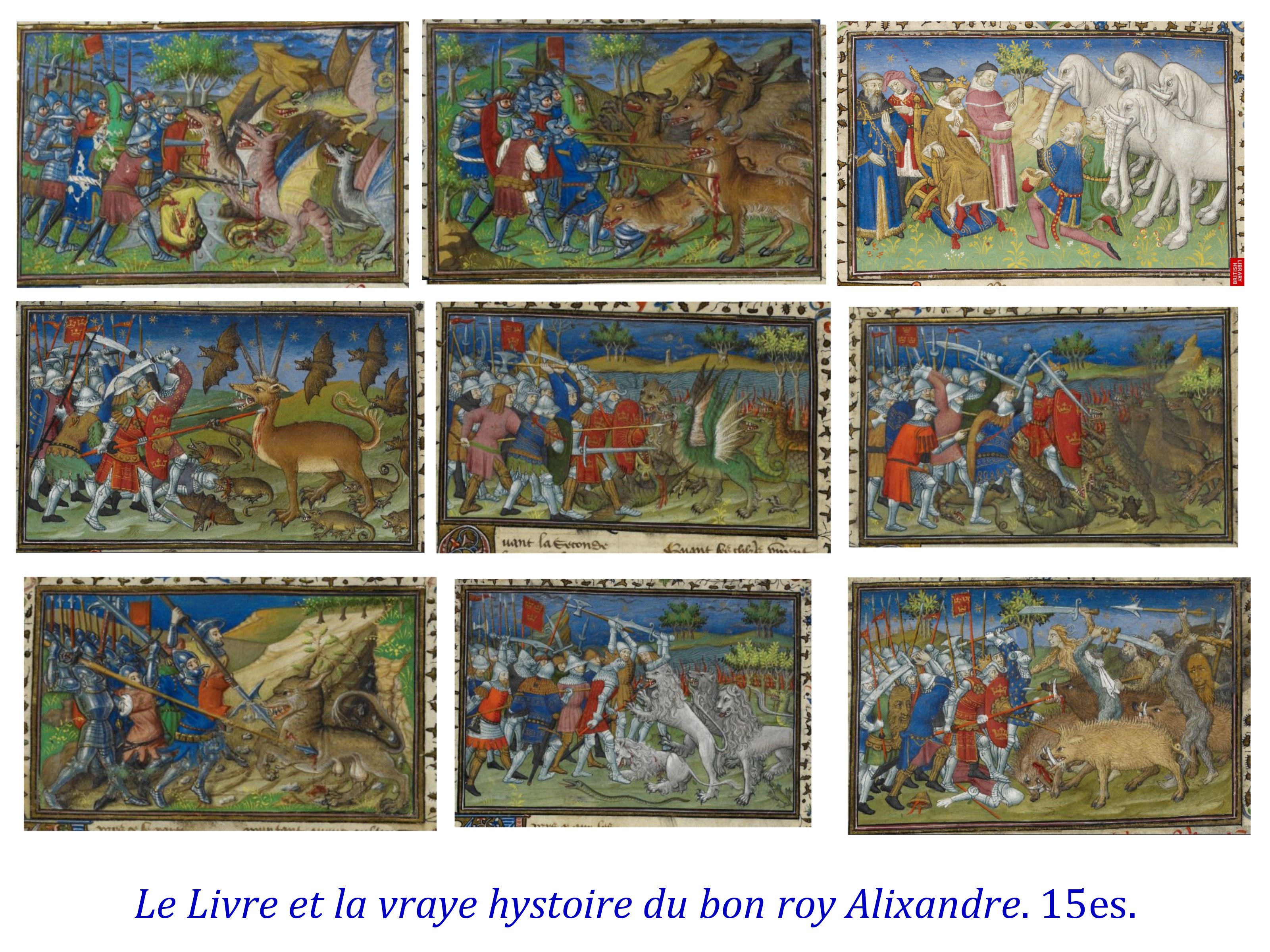 Les bestiaires sont étonnants ; la plupart d’entre-eux reprenant les mêmes textes grecs : le « Nicandre de Colophon » par exemple. On retrouve exactement les mêmes figures et caractéristiques, de la licorne, du Caladrius, du tigre ( attrapé grâce au miroir), de la hyène profanatrice de tombes, au bison pestilentiel, comme le chien fidèle, vengeur et chasseur mais aussi le pélican figure du sacrifice christique ( erreur d’interprétation de la becquée des pélicans – ceux ci écrasant les poissons pêchés dans leur poche de bec, avant de les offrir saignants à leur progéniture- furent compris comme se blessant jusqu’au sang pour offrir leur chair. Sacrifice christique, royal et/ou patriarcal) ; on trouve encore à foison les éléphants d’ Alexandre et Hannibal, machines de guerre représentées de façon peut naturaliste.