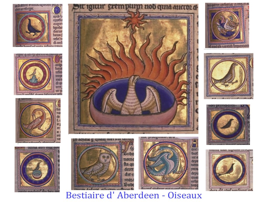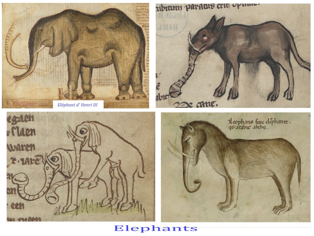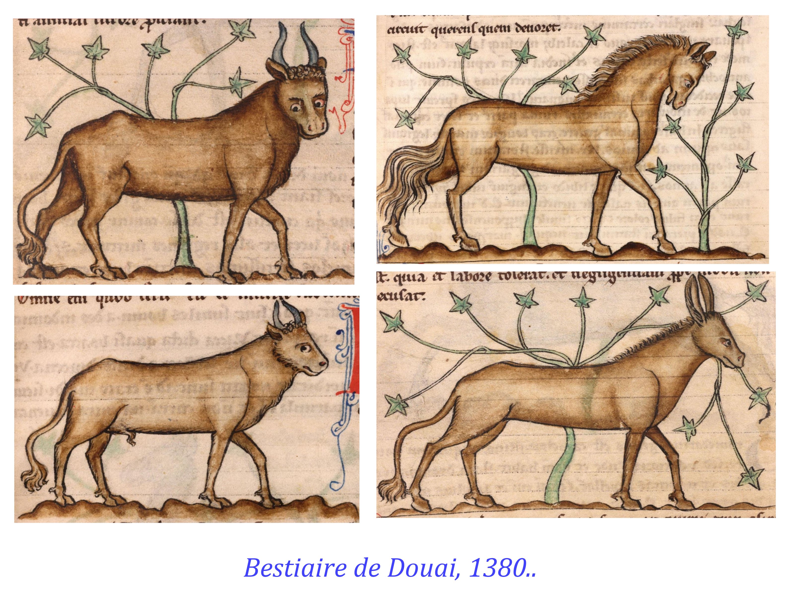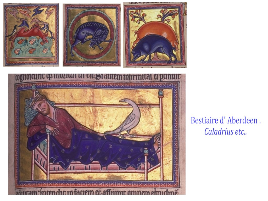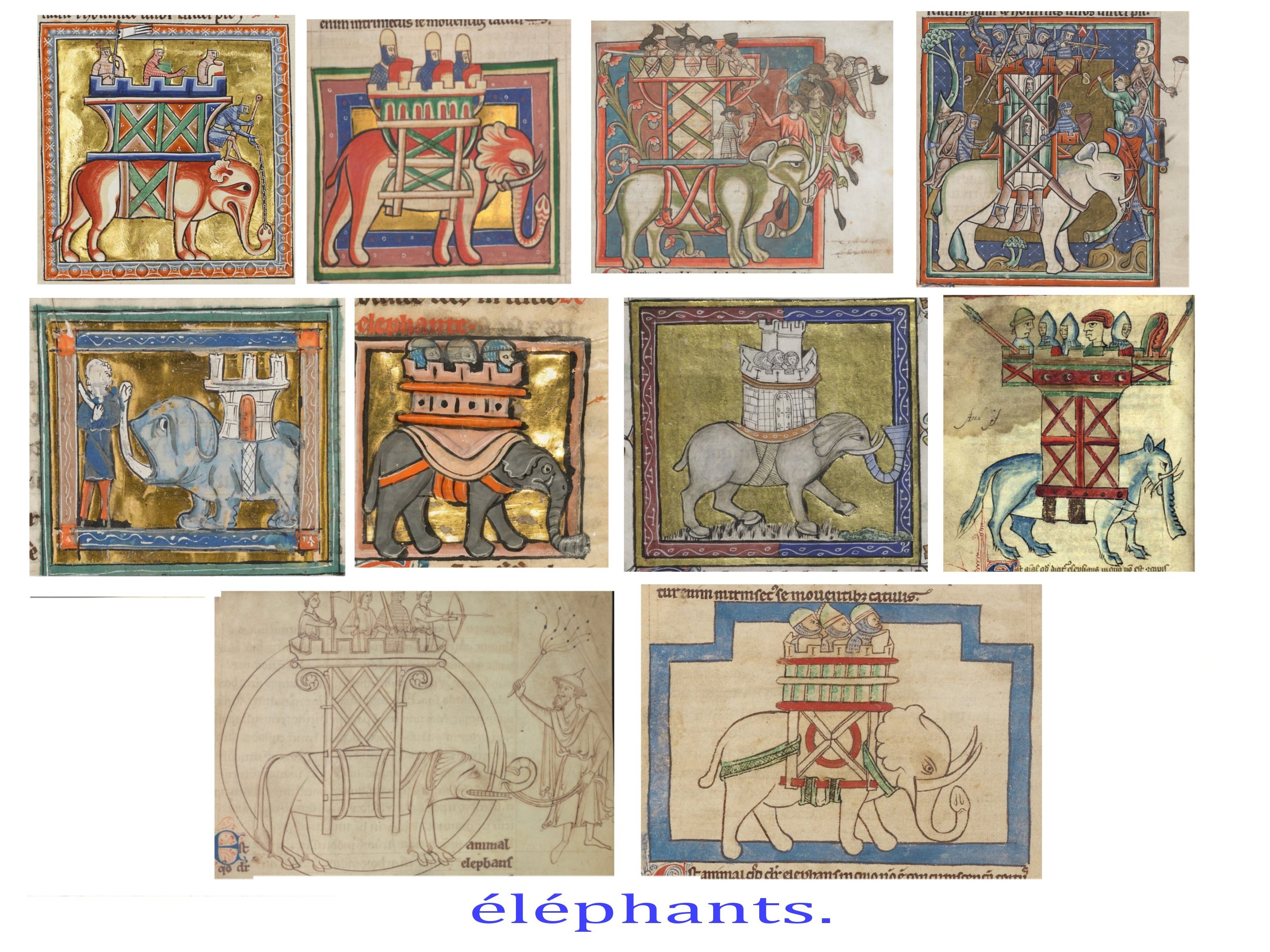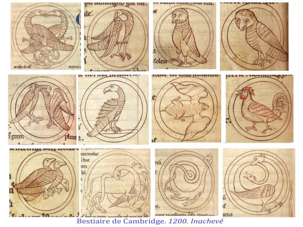 Les bestiaires sont étonnants ; la plupart d’entre-eux reprenant les mêmes textes grecs : le « Nicandre de Colophon » par exemple. On retrouve exactement les mêmes figures et caractéristiques, de la licorne, du Caladrius, du tigre ( attrapé grâce au miroir), de la hyène profanatrice de tombes, au bison pestilentiel, comme le chien fidèle, vengeur et chasseur mais aussi le pélican figure du sacrifice christique ( erreur d’interprétation de la becquée des pélicans – ceux ci écrasant les poissons pêchés dans leur poche de bec, avant de les offrir saignants à leur progéniture- furent compris comme se blessant jusqu’au sang pour offrir leur chair. Sacrifice christique, royal et/ou patriarcal) ; on trouve encore à foison les éléphants d’ Alexandre et Hannibal, machines de guerre représentées de façon peut naturaliste.