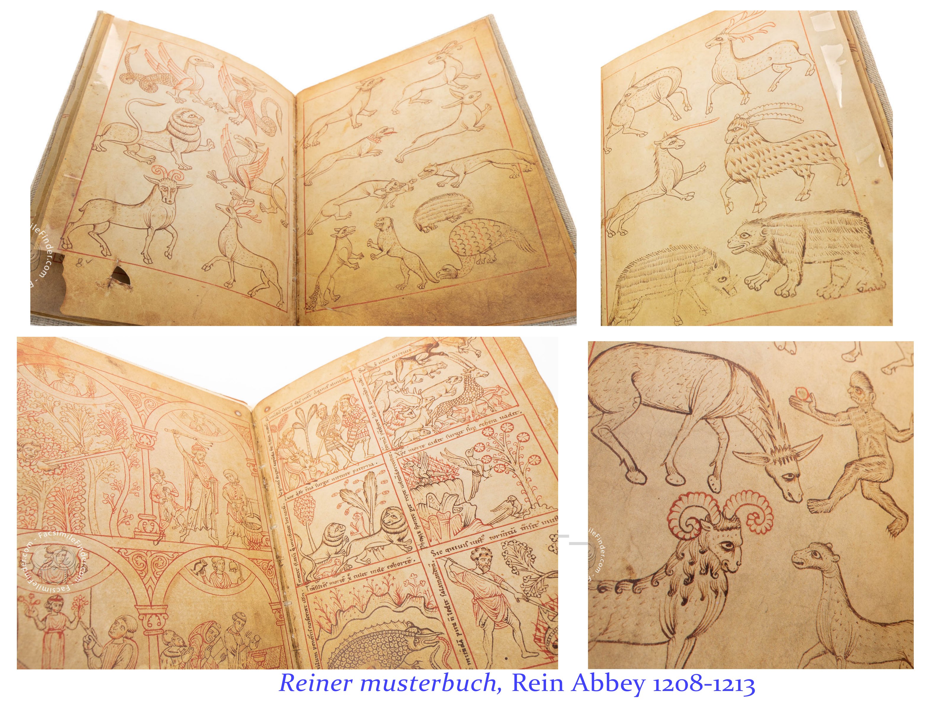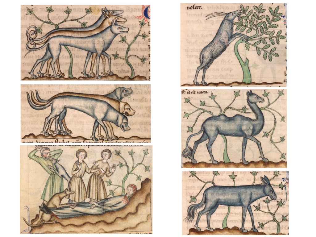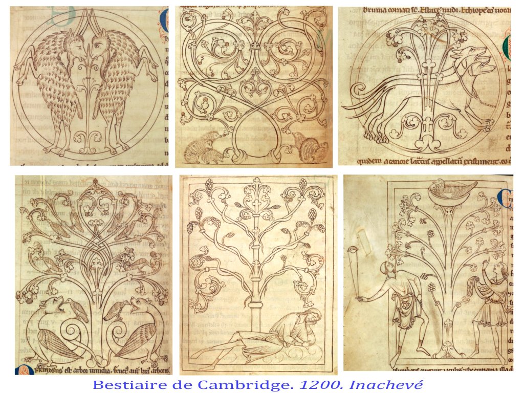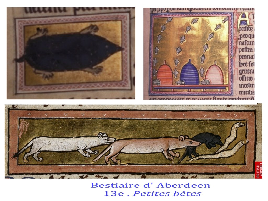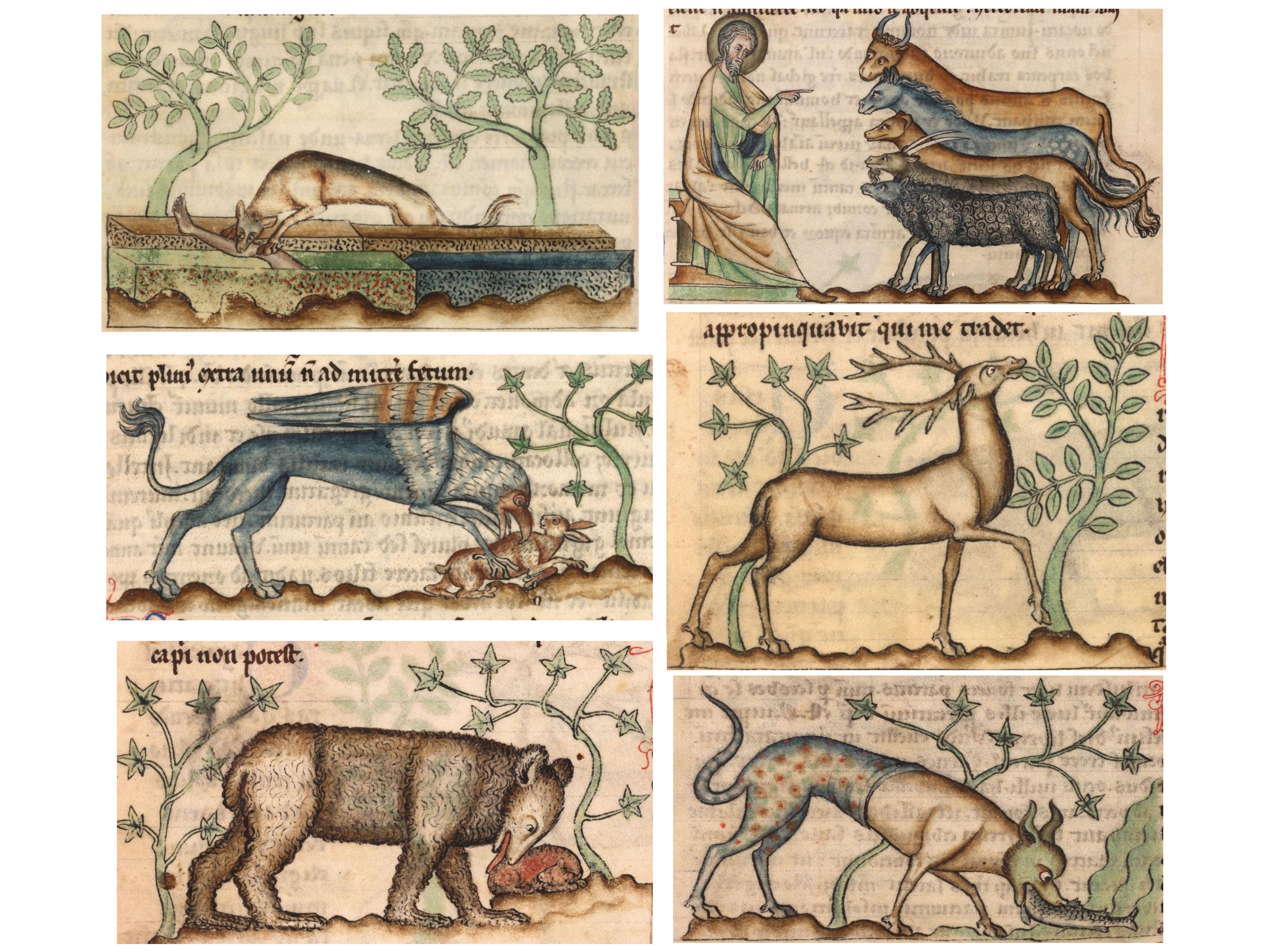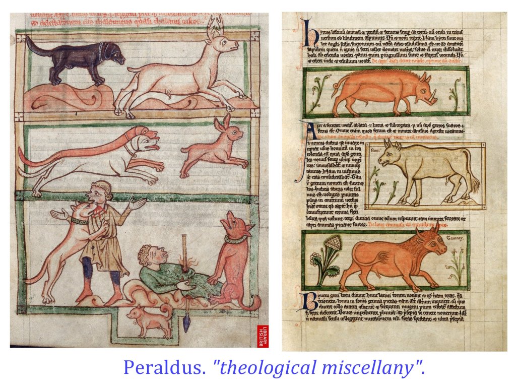 Les bestiaires sont étonnants ; la plupart d’entre-eux reprenant les mêmes textes grecs : le « Nicandre de Colophon » par exemple. On retrouve exactement les mêmes figures et caractéristiques, de la licorne, du Caladrius, du tigre ( attrapé grâce au miroir), de la hyène profanatrice de tombes, au bison pestilentiel, comme le chien fidèle, vengeur et chasseur mais aussi le pélican figure du sacrifice christique ( erreur d’interprétation de la becquée des pélicans – ceux ci écrasant les poissons pêchés dans leur poche de bec, avant de les offrir saignants à leur progéniture- furent compris comme se blessant jusqu’au sang pour offrir leur chair. Sacrifice christique, royal et/ou patriarcal) ; on trouve encore à foison les éléphants d’ Alexandre et Hannibal, machines de guerre représentées de façon peut naturaliste.