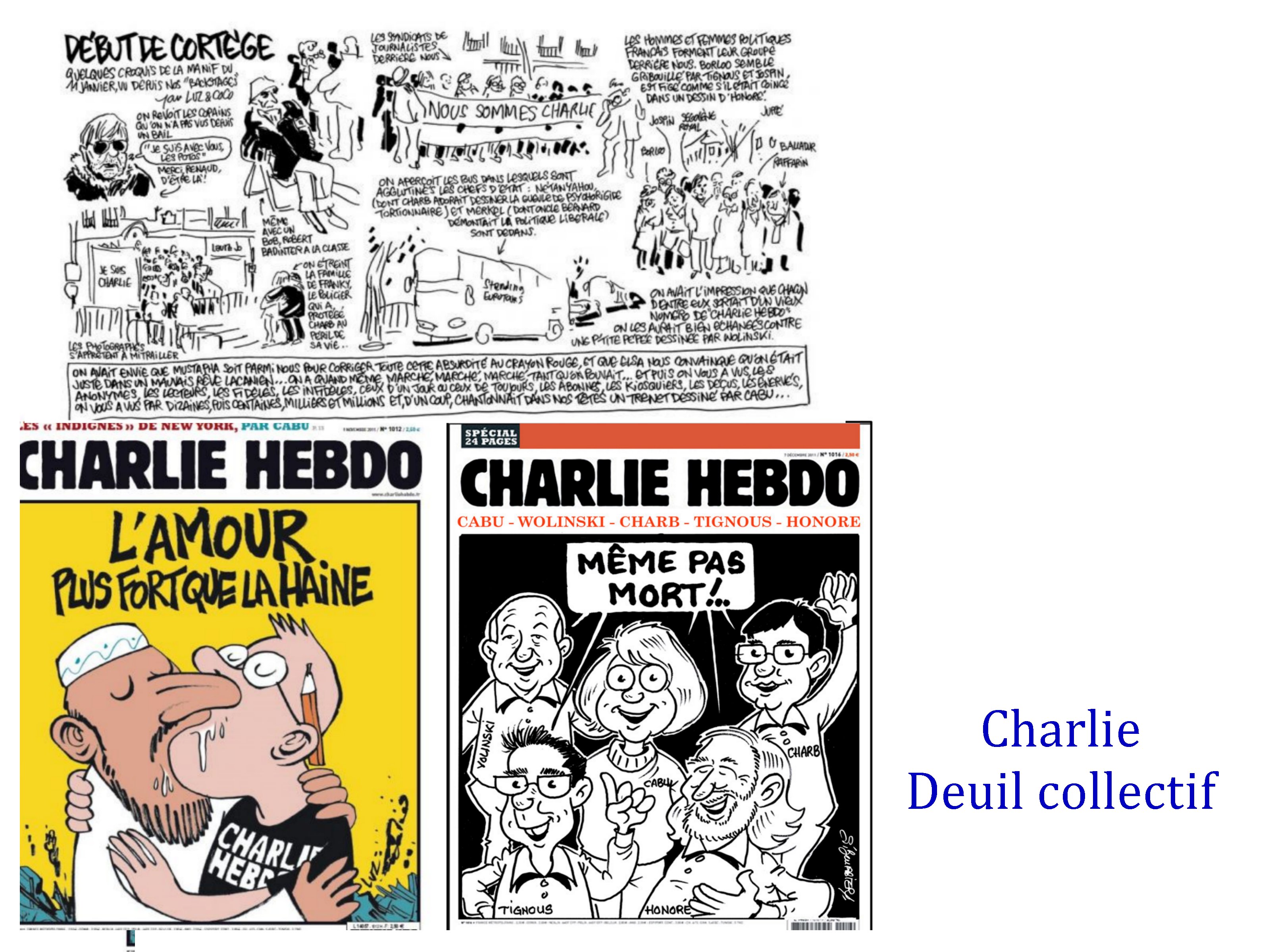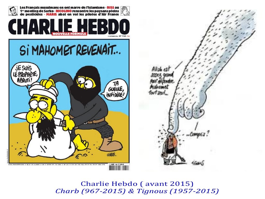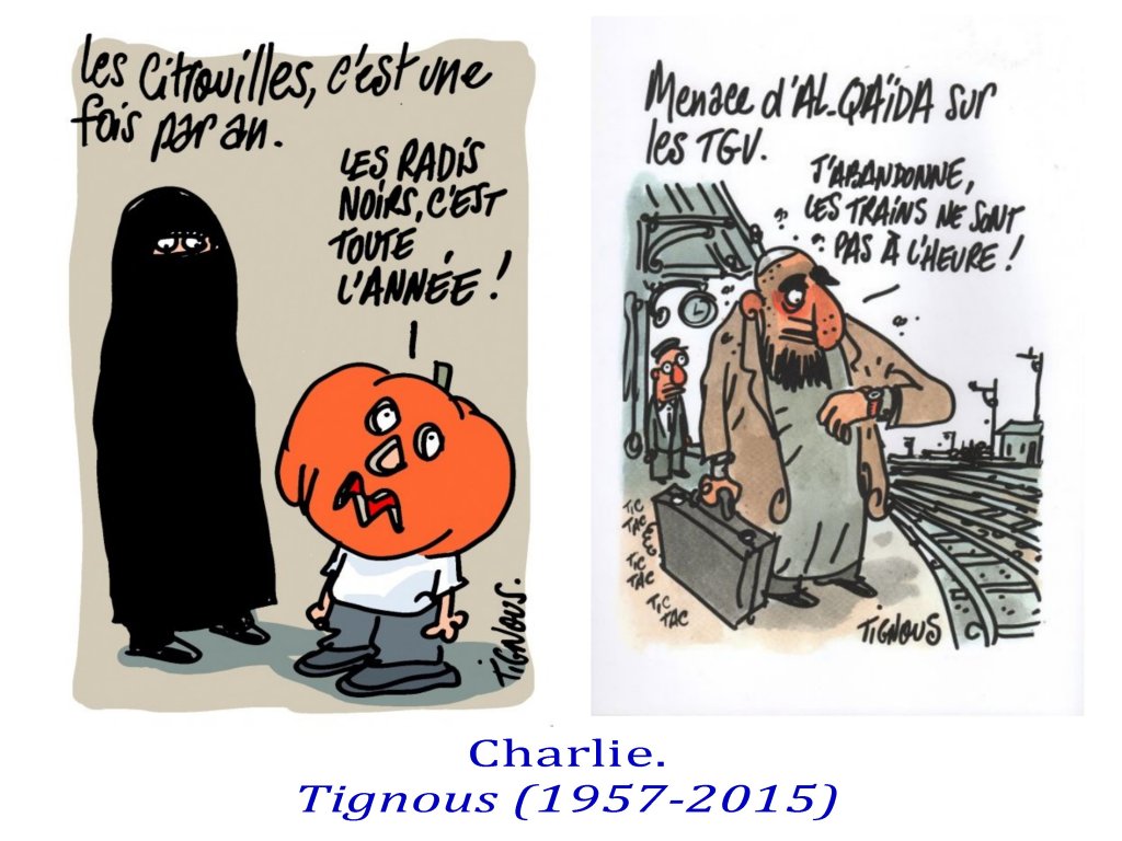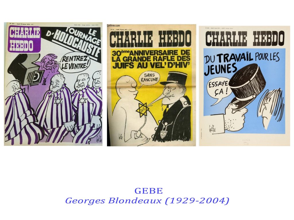Ces caricaturistes-journalistes-chroniqueurs étaient capables d’exiger une lecture fine de leur dessins, exigeant une capacité de subtilité autour de valeurs communes, afin de ne jamais prendre leurs apparentes provocations au pied de la lettre. Les meilleurs exemples, étaient déjà deux de Gébé sur l’antisémitisme, et furent aussi ceux de Cabu, Tignous, Charb sur l’ Islam avec le fameux » c’est dur d’être aimé par des cons » de Cabu. Le présupposé de cette virulence étant que nous sommes capables de « faire société ».