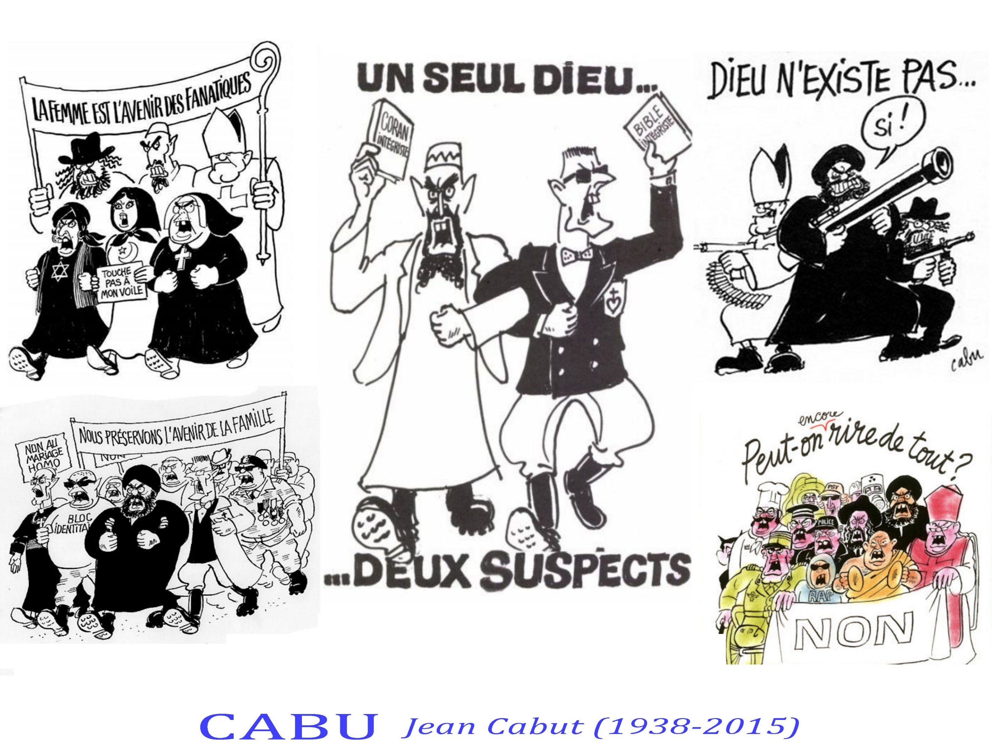 Cabu déjà pointait cette disparition de l’humour autour de ces fameuse « identités », dans son dessin » peut-on rire de tout », dans lequel, du RAP aux Chefs étoilés, en passant par les boxeurs, les fanatiques du nucléaire et les religieux, il devient évident que le sens de l’humour, qui doit commencer par l’ autodérision ( « celui qui sait rire de lui même, n’a pas fini de s’amuser »- proverbe « chinois ») est en chute libre.