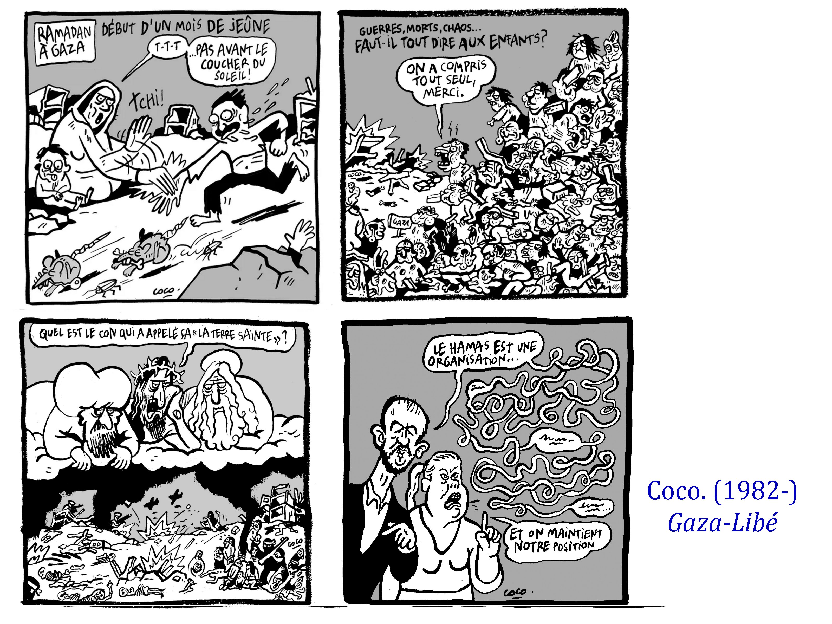 C’est encore l’exemple navrant du dernier dessin de Coco, sur Gaza en novembre 2024, qui lui valut les foudres de quelques députés ( dépités) de LFI, incapables de comprendre la subtilité d’un dessin de presse, ignares et barricadés dans leur démagogie envers l’obscurantisme islamiste, au nom d’une défense aveugle des palestiniens, assimilés ( malgré nombre d’entre-eux) à un islamisme radical et liberticide.
