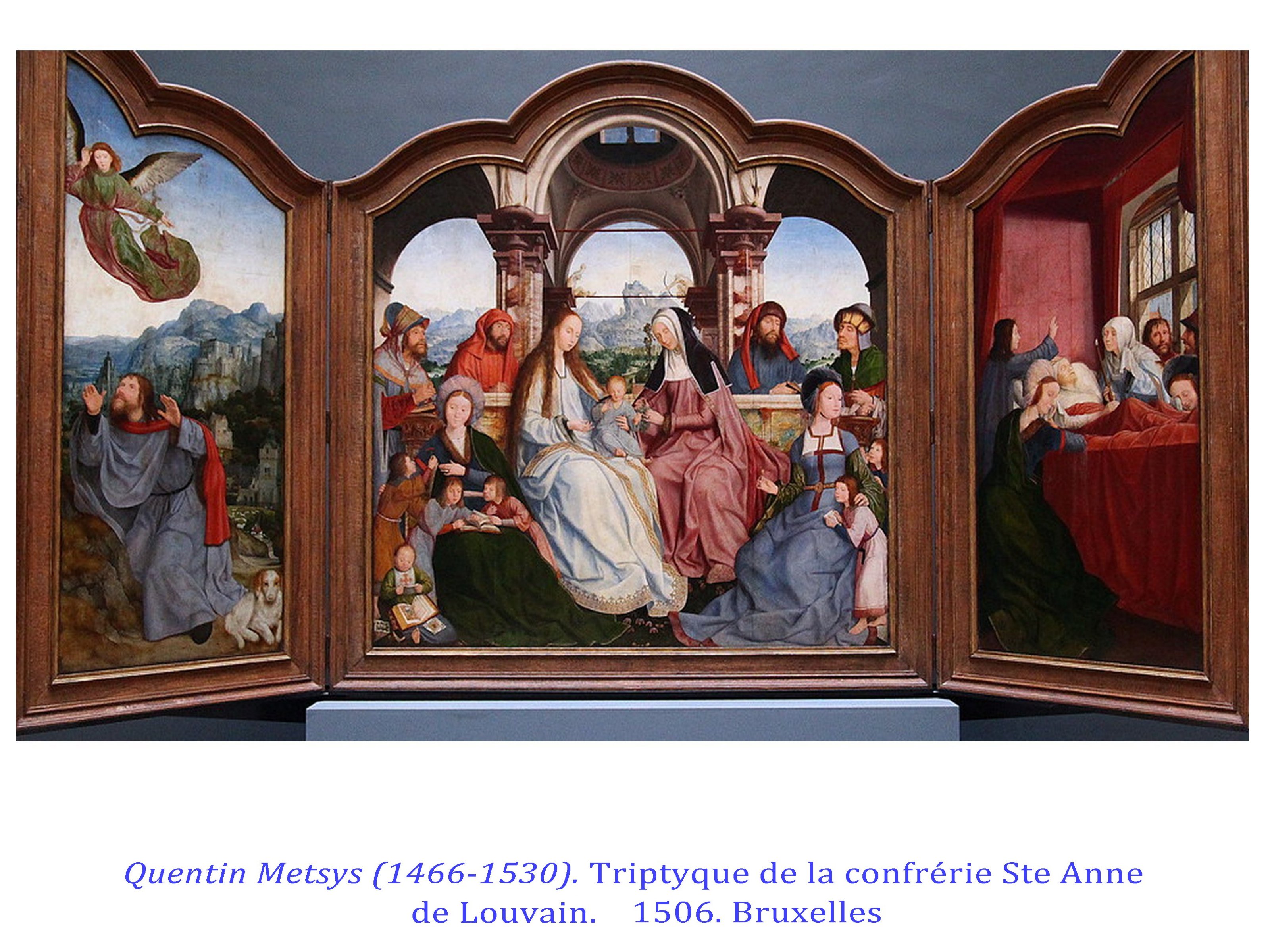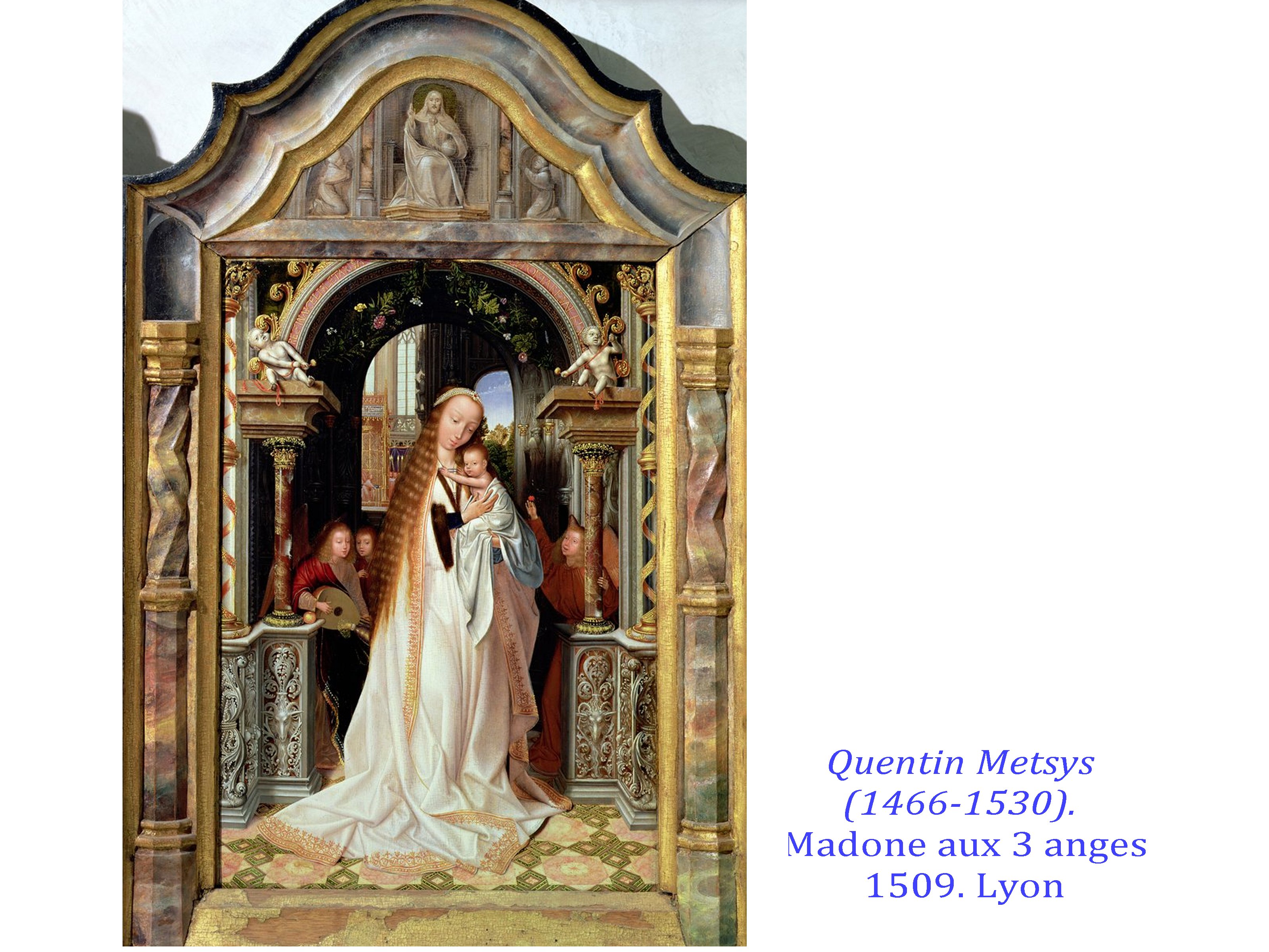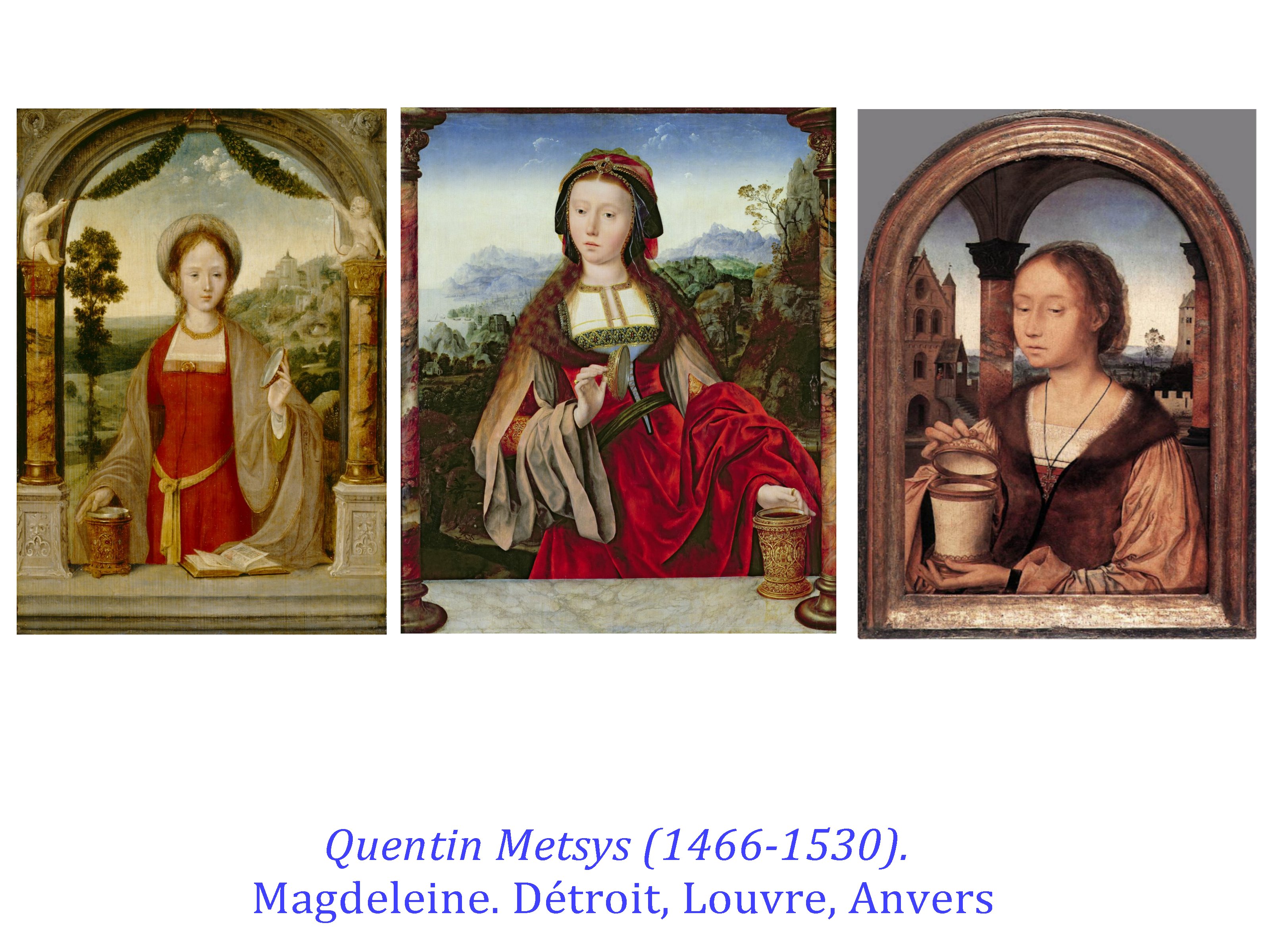 On voit clairement, avec Metsys par exemple, la continuation d’une esthétique sacrée, autour de ses madones et Madeleines, mais aussi l’exploration des turpitudes humaines, comme de points de vue bien terrestres et subjectifs ( le Christ crucifié sur le Golgotha).