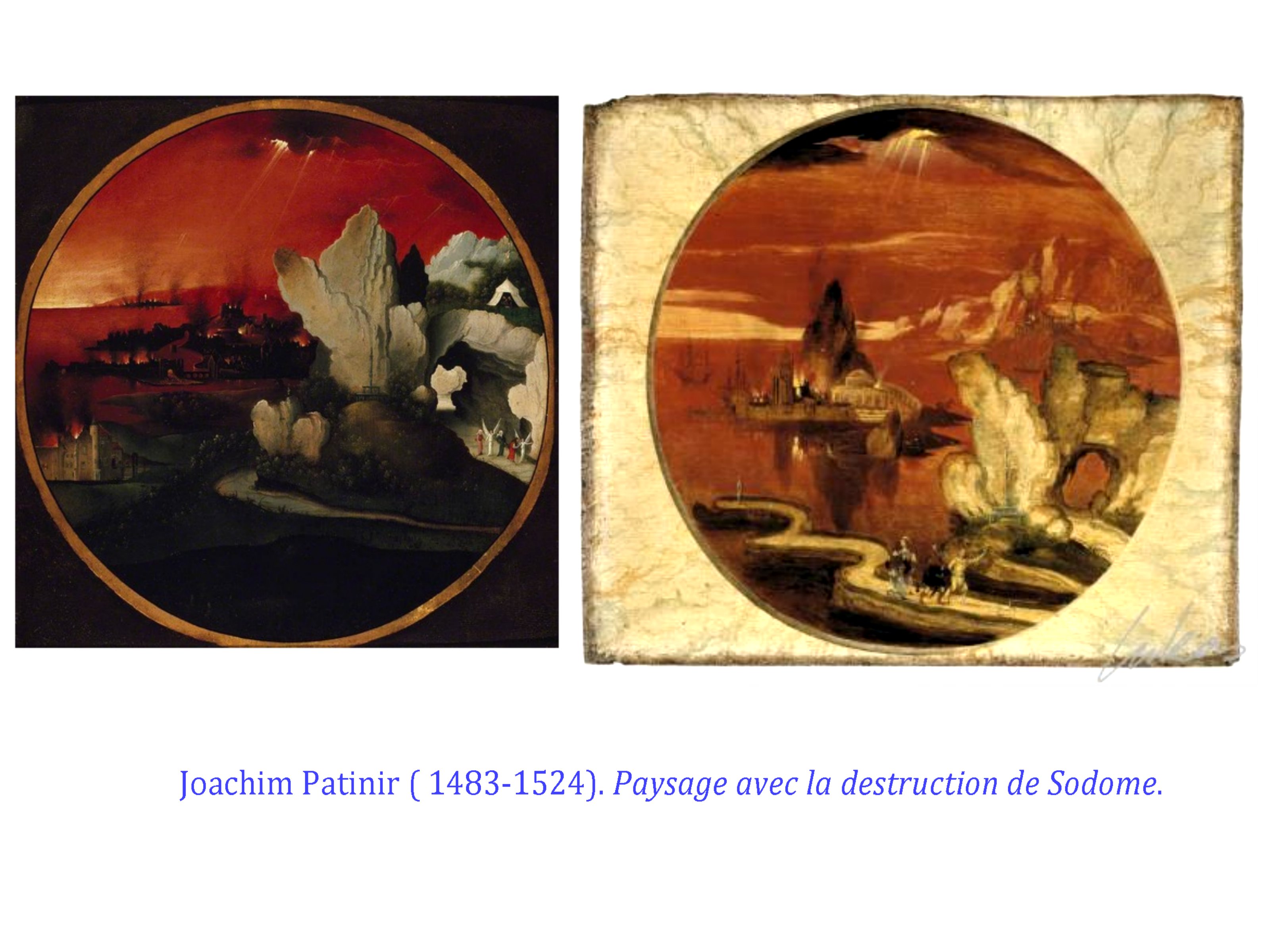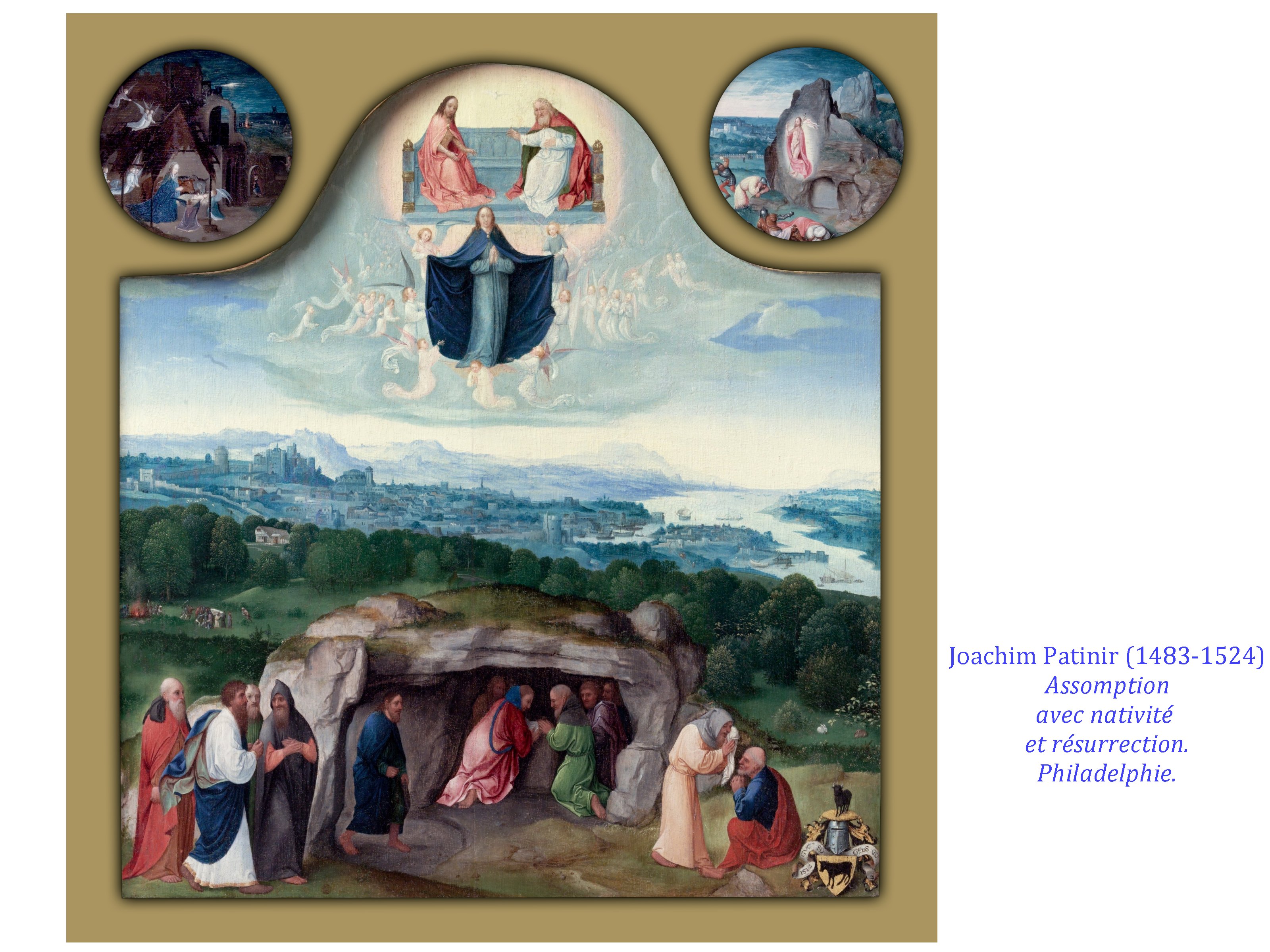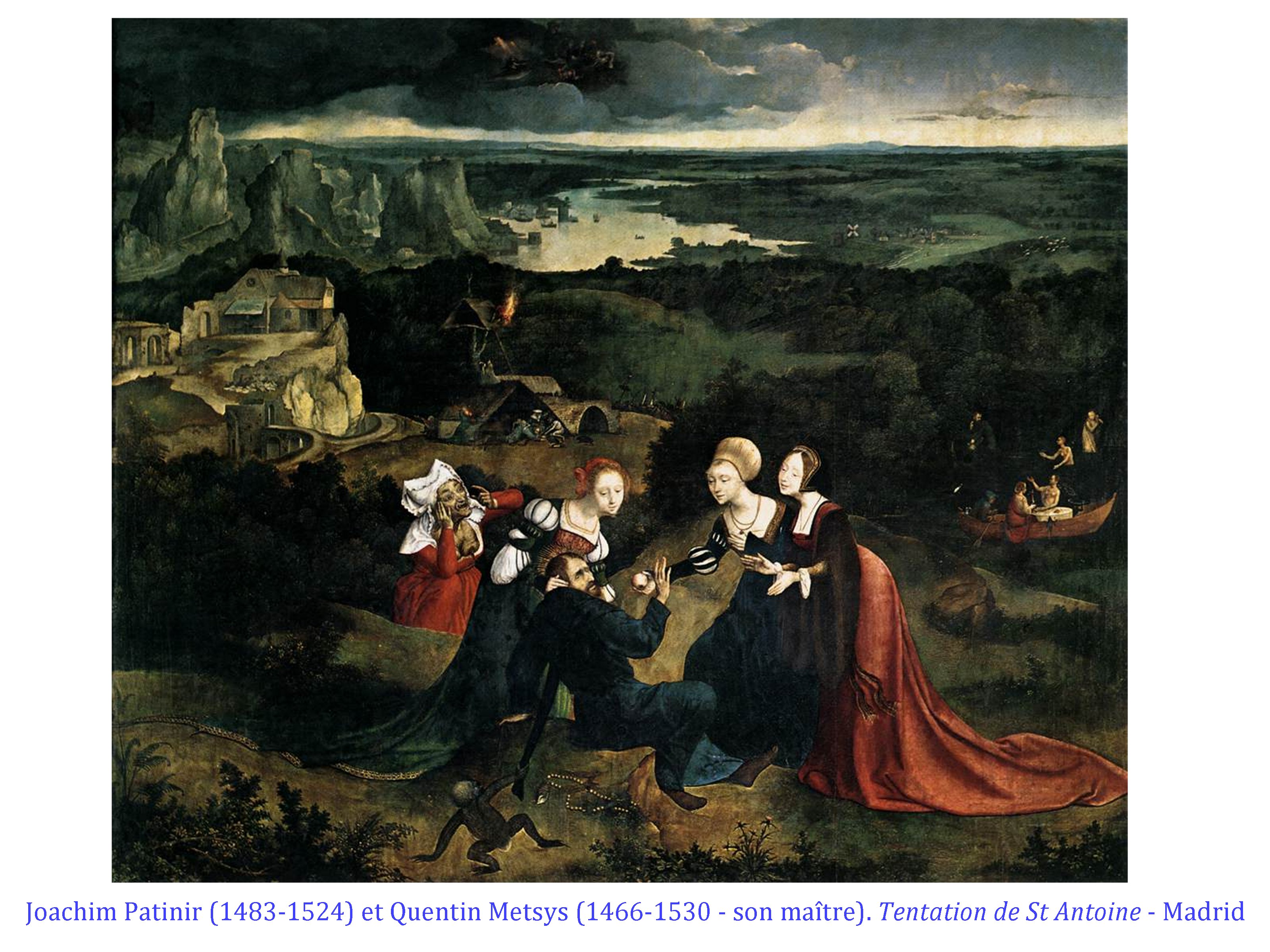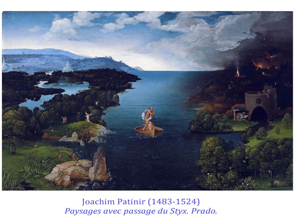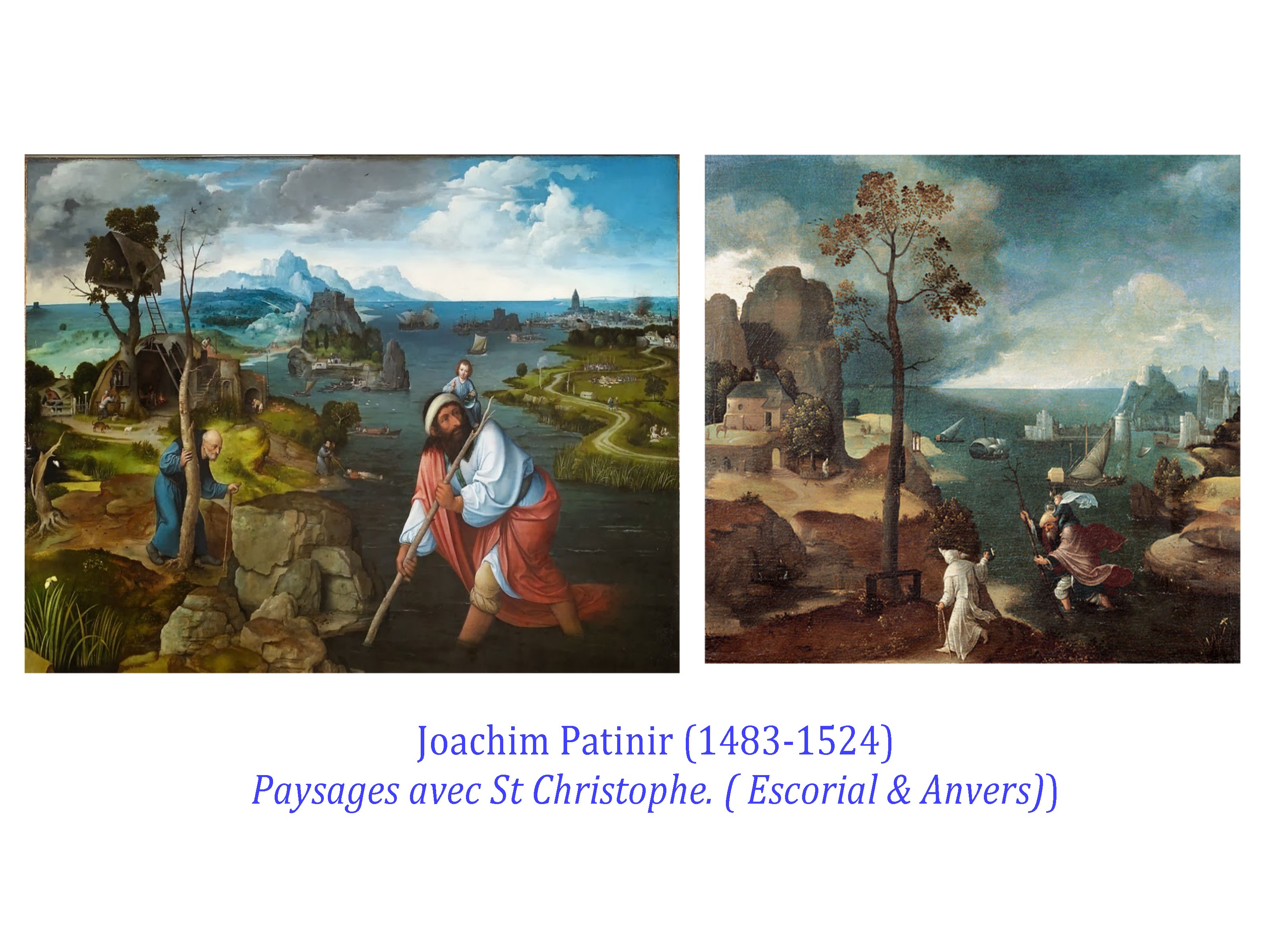 Le cas de Joachim Patinir est singulier, élève de Metsys, il expérimente les paysages panoramiques aux dégradés d’une grande délicatesse, mais mettant en scène des solitudes existentielles, dans des espaces suggérant une nouvelle notion, celle de l’infinitude.
