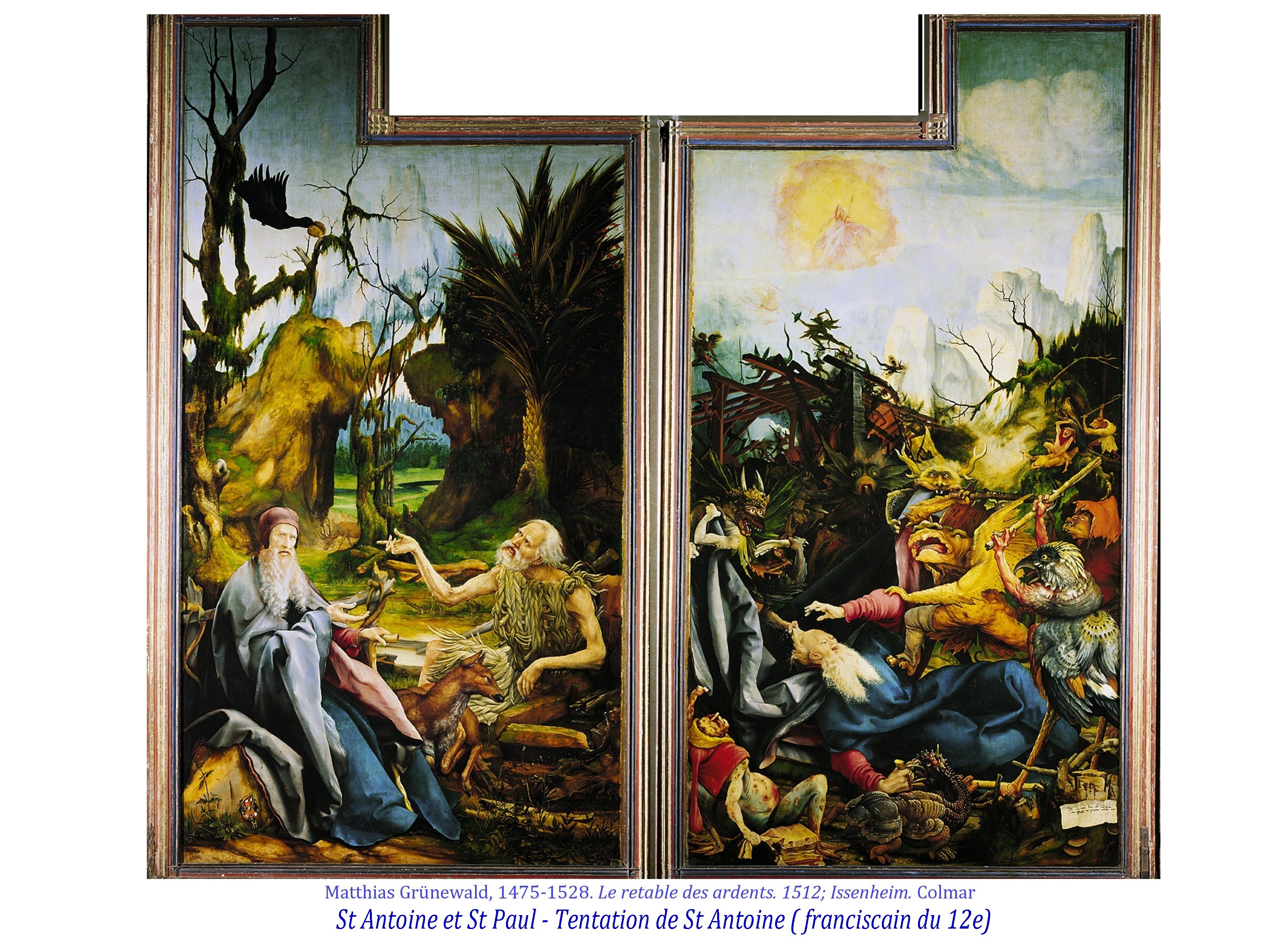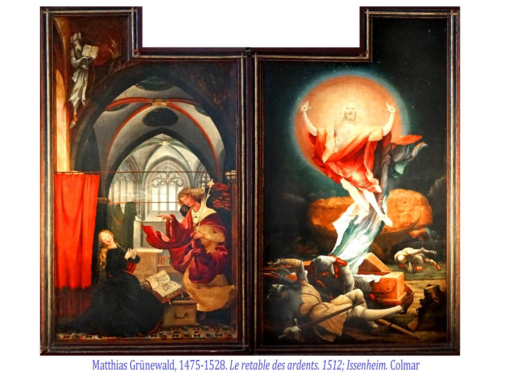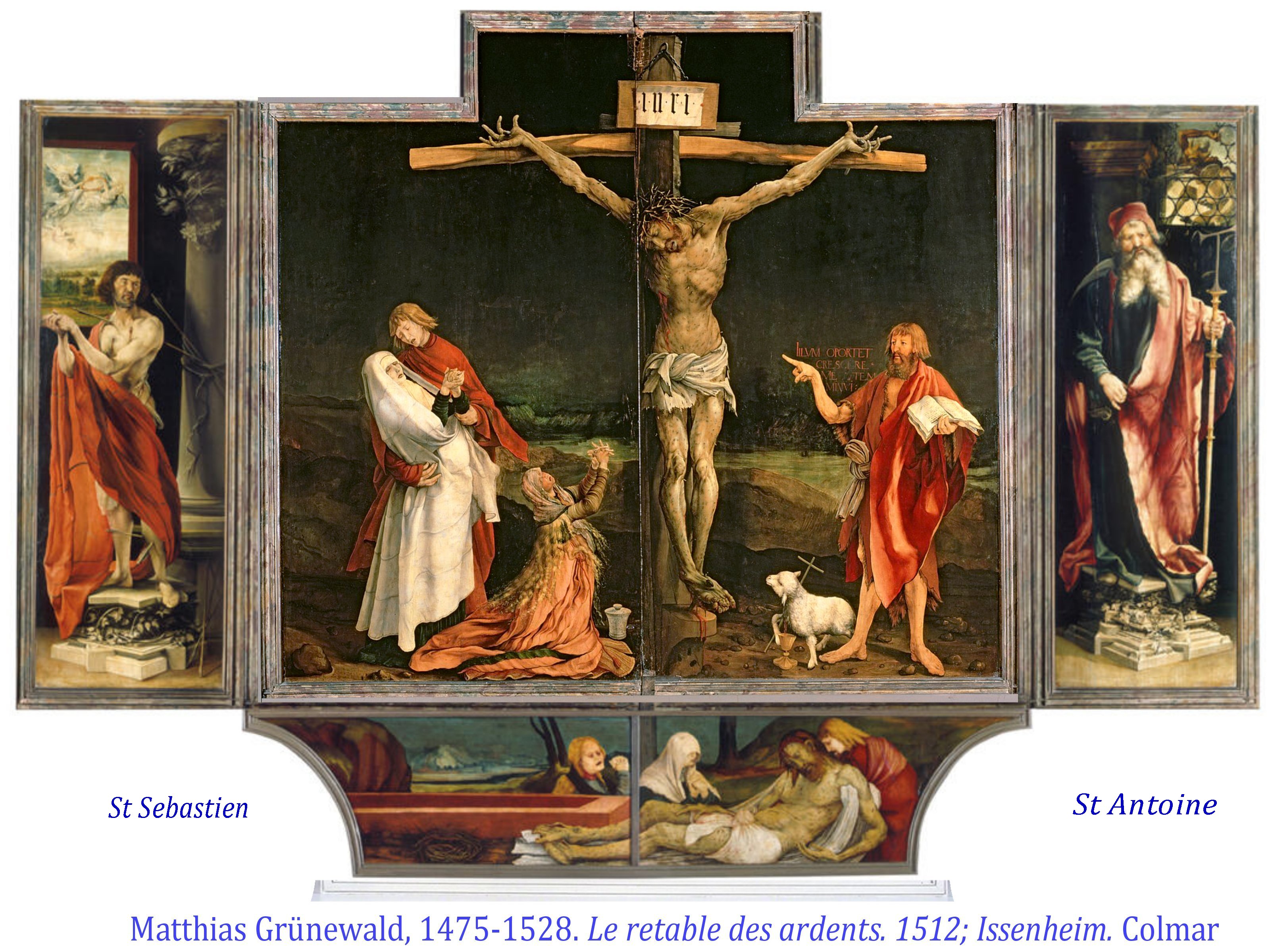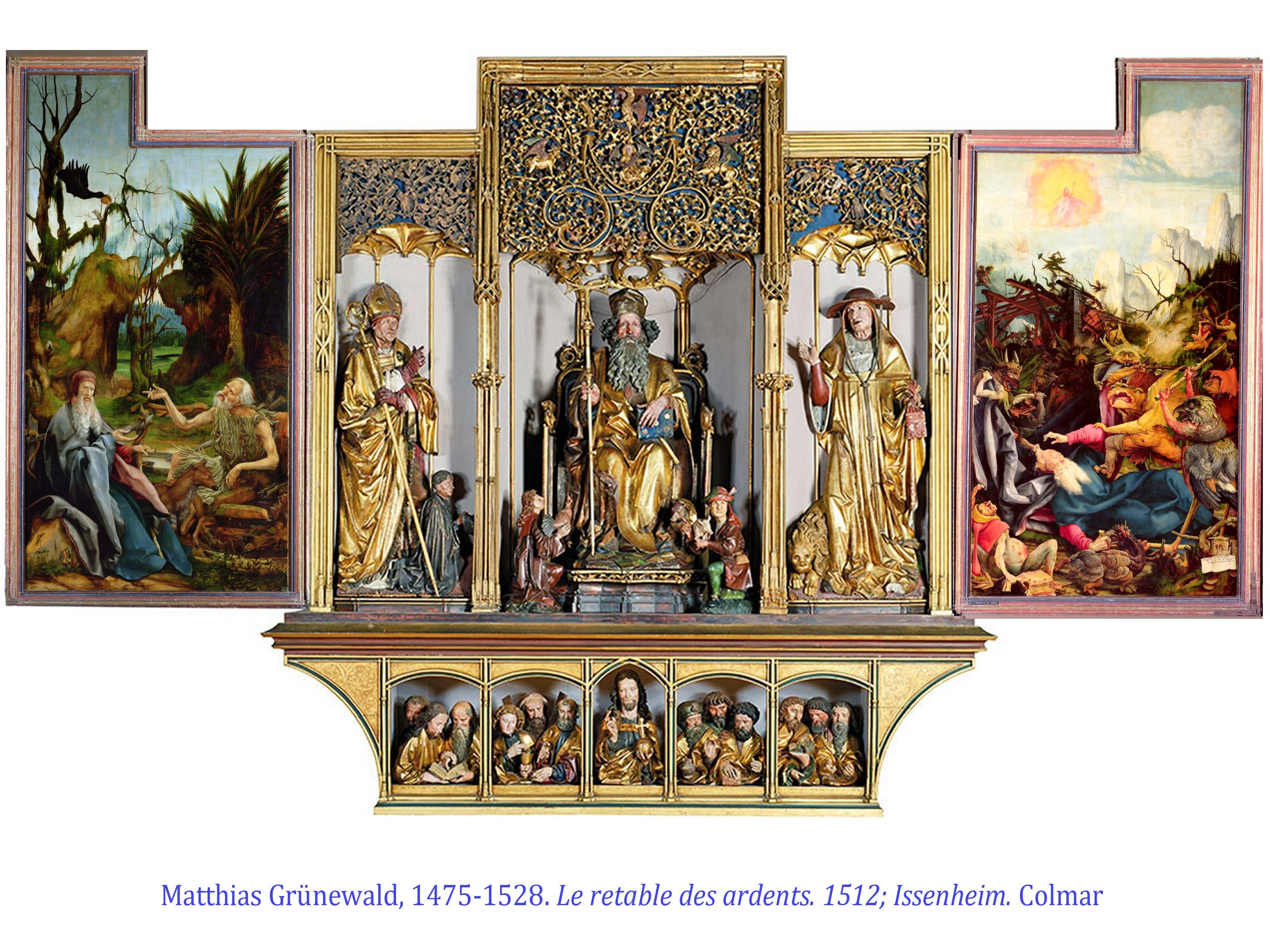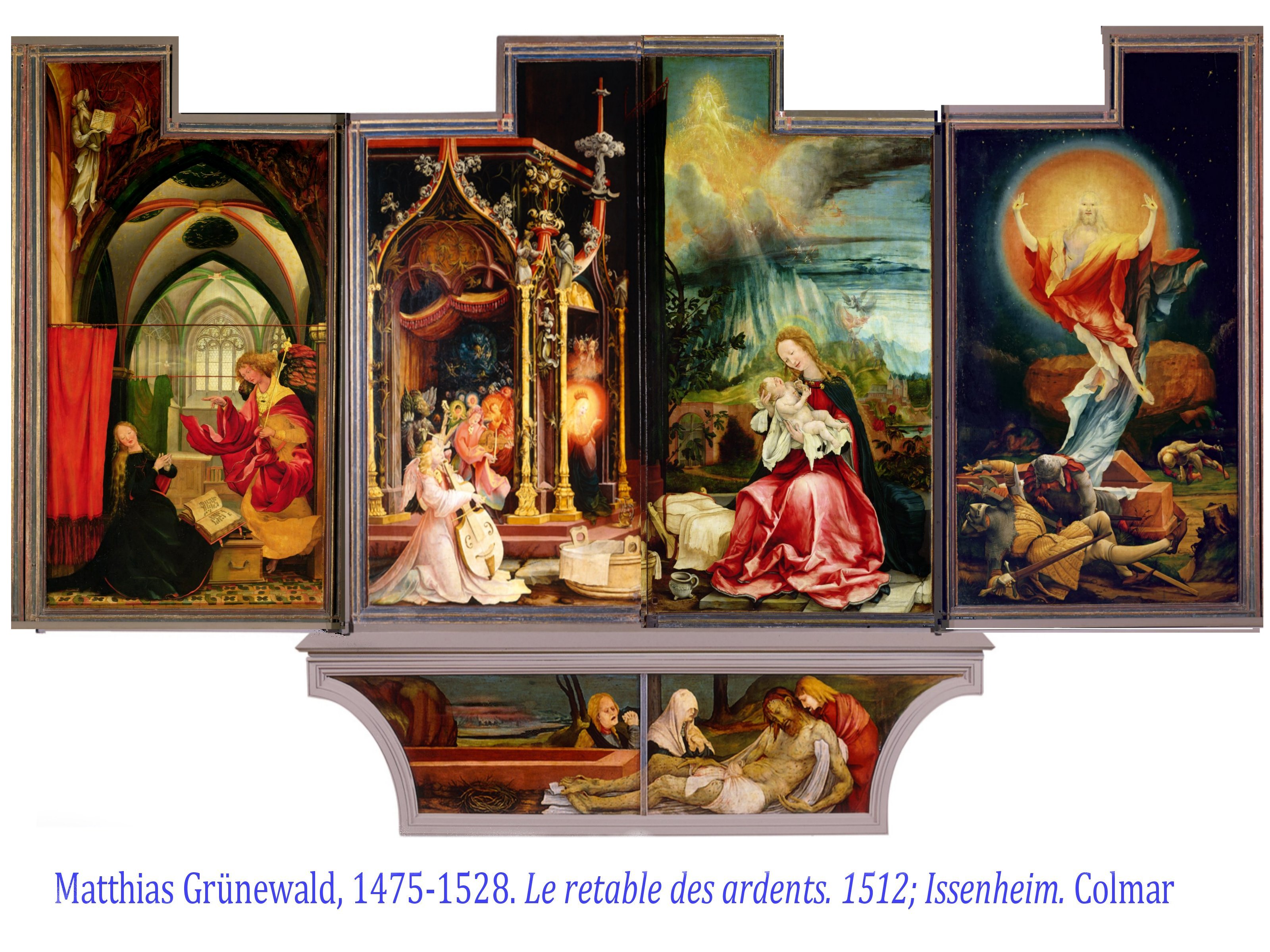 Matthias Grünewald, avec le retable des ardents, créée un ex-voto hallucinant, digne continuateur des apocalypses. Il ne s’agit pas de convoquer la « raison » ni une beauté sacrée car divine, mais d’évoquer les tourments physiques et psychiques ( de l’âme) des humains.