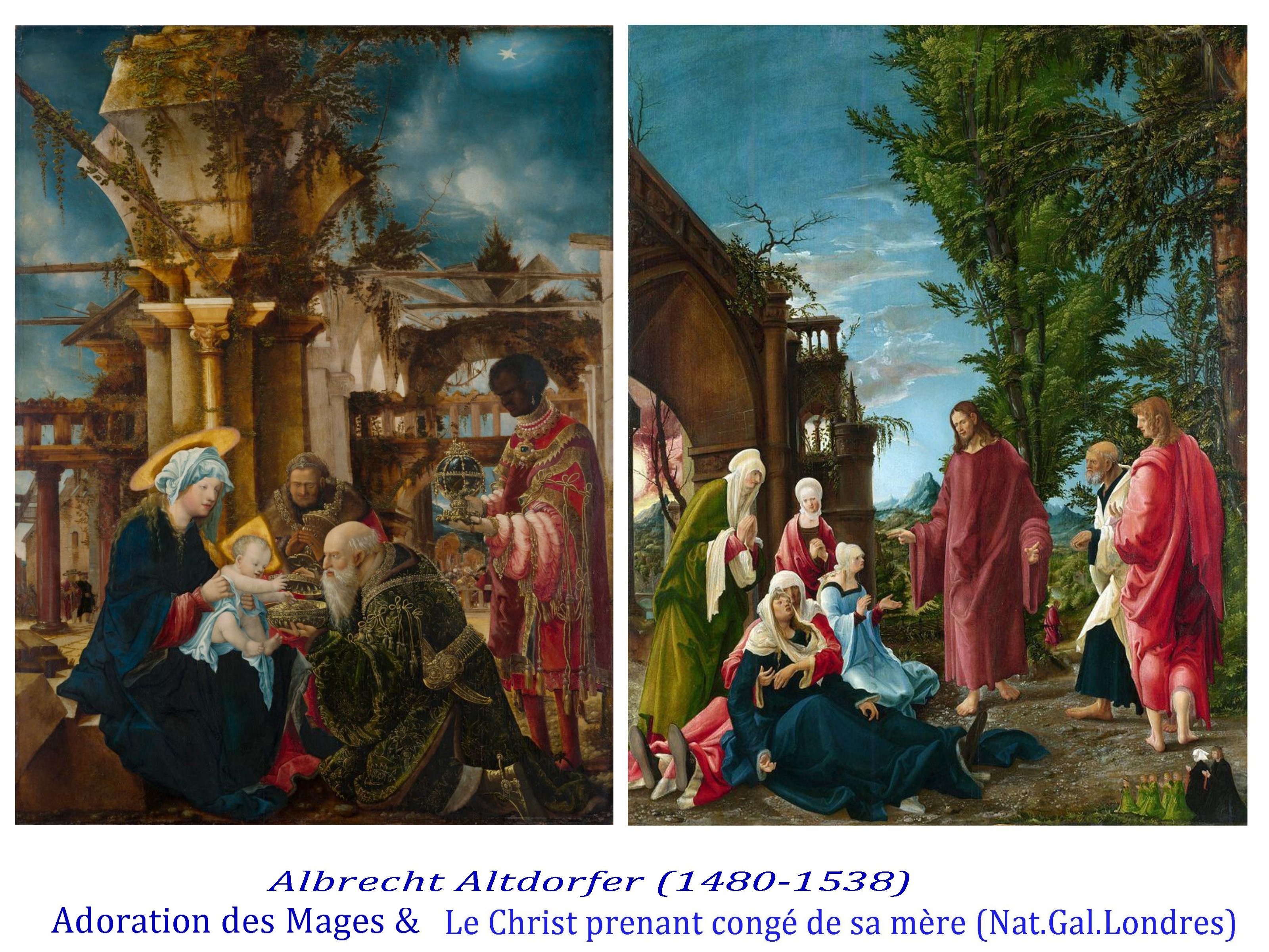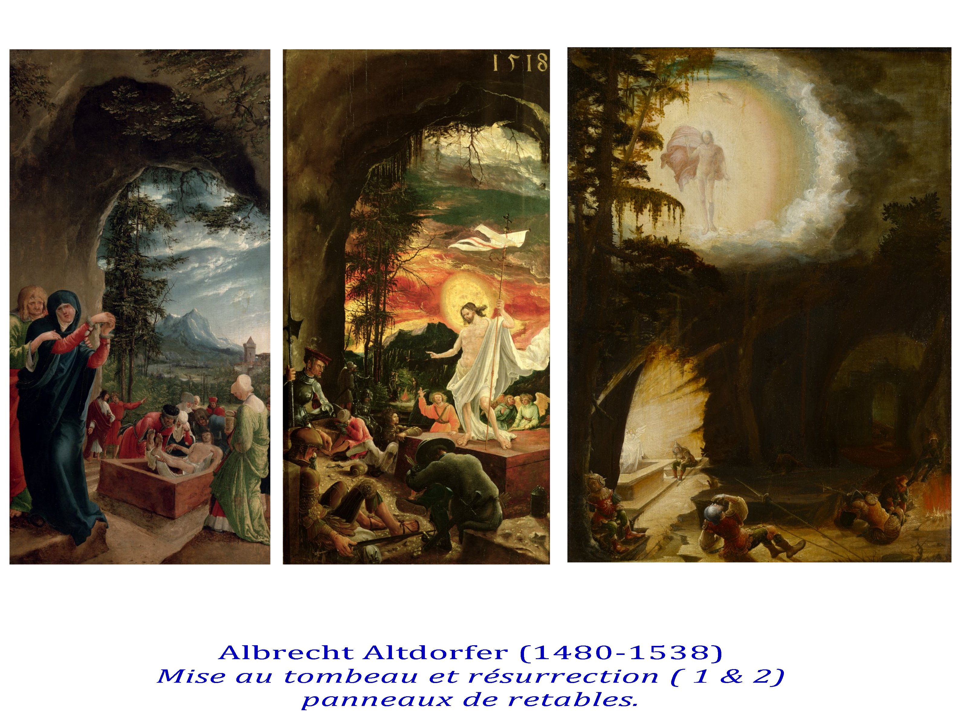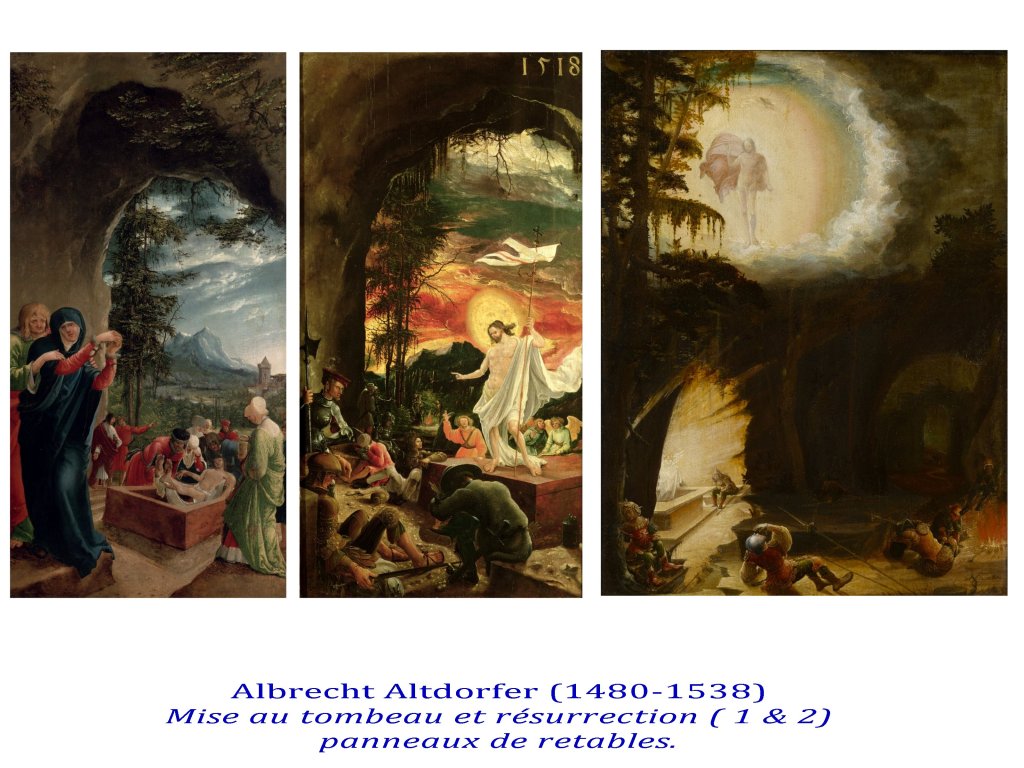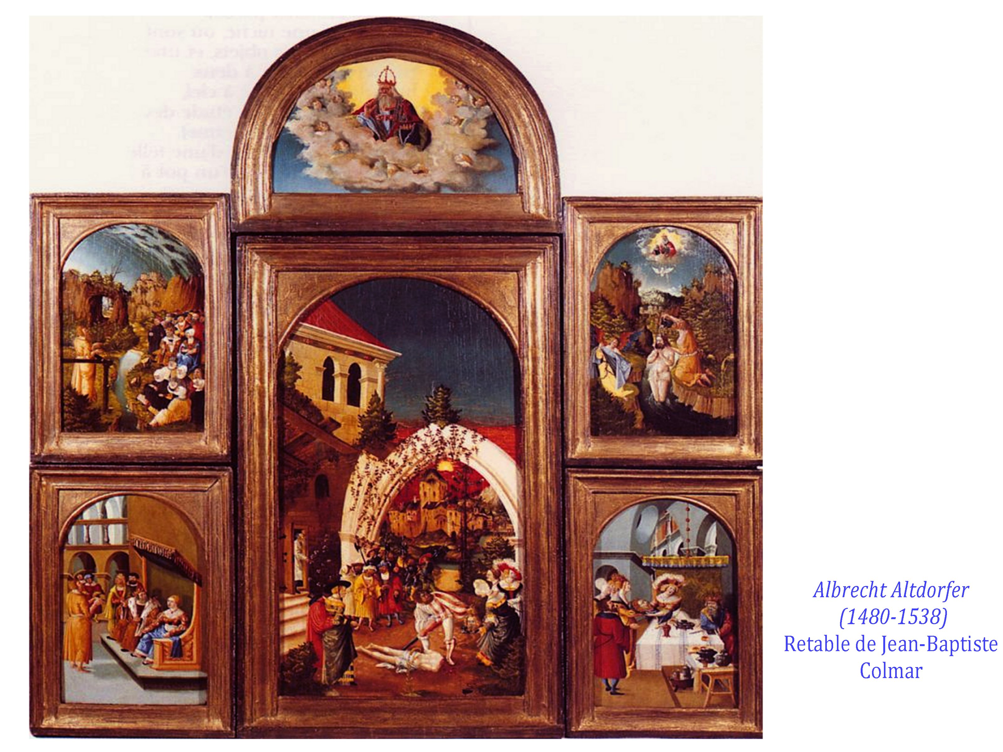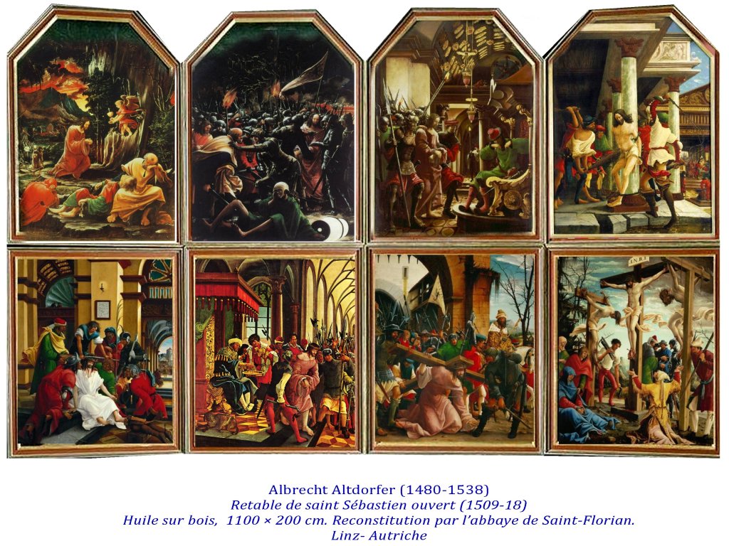Altodorfer propose des cadrages et des lumières singuliers, dramatisant et captant l’attention, pour des retables aux architectures sacrées, permettant d’intégrer la diversité des compositions. Comme l’étaient les prédelles italiennes et les grands « Retaules » catalans contemporains du 15e siècle.