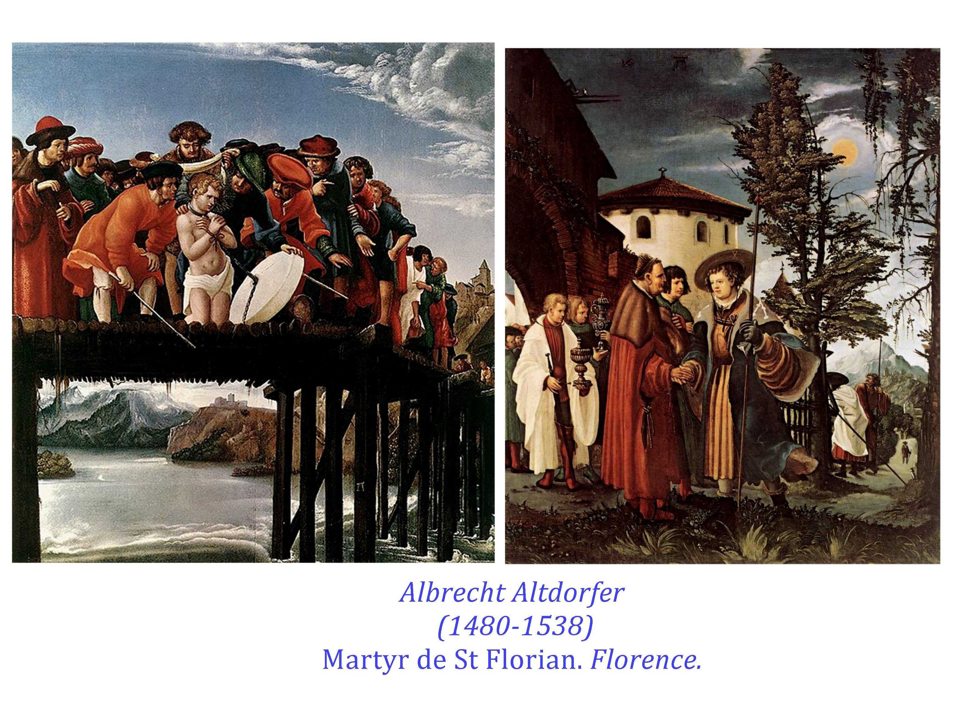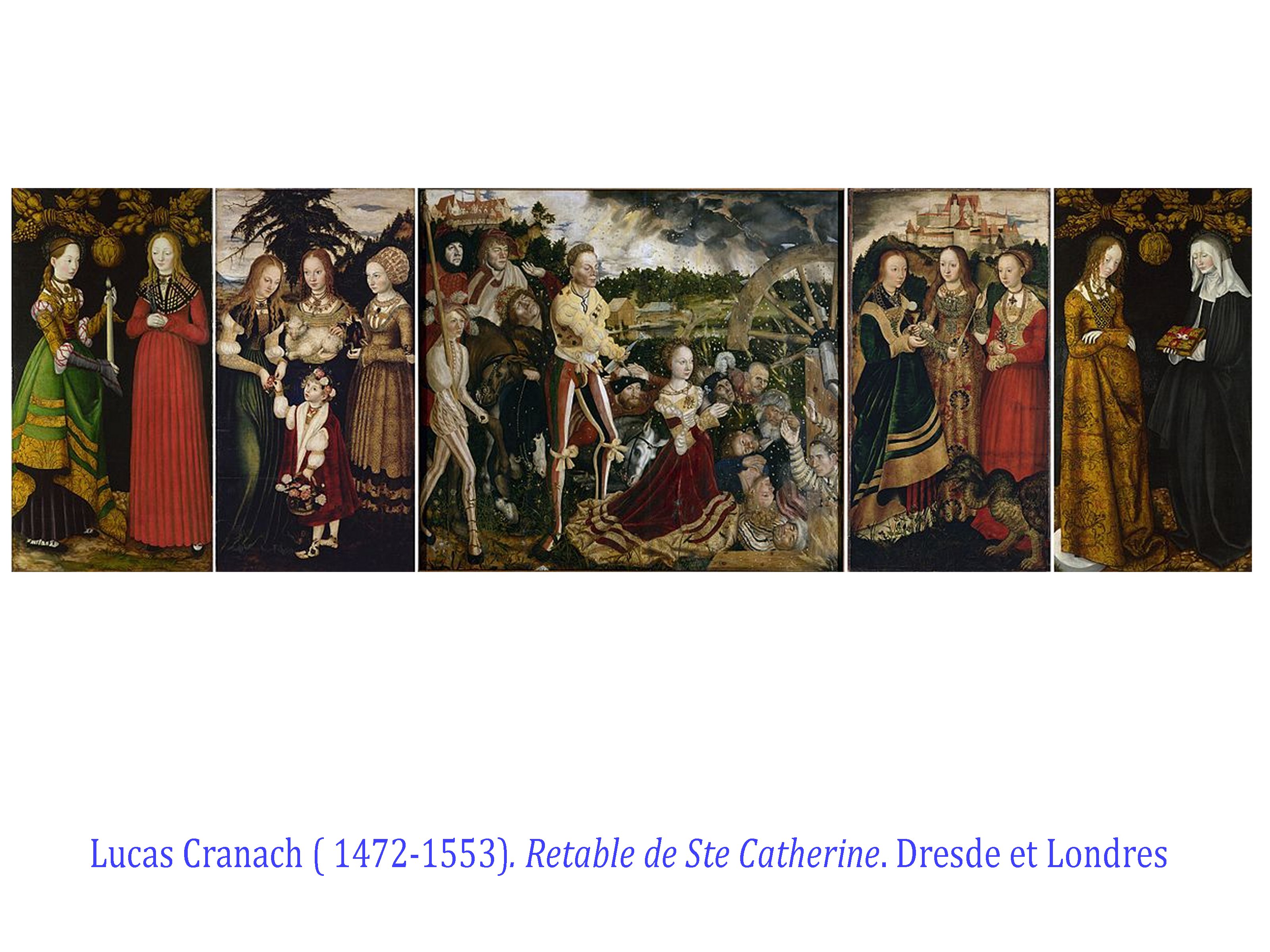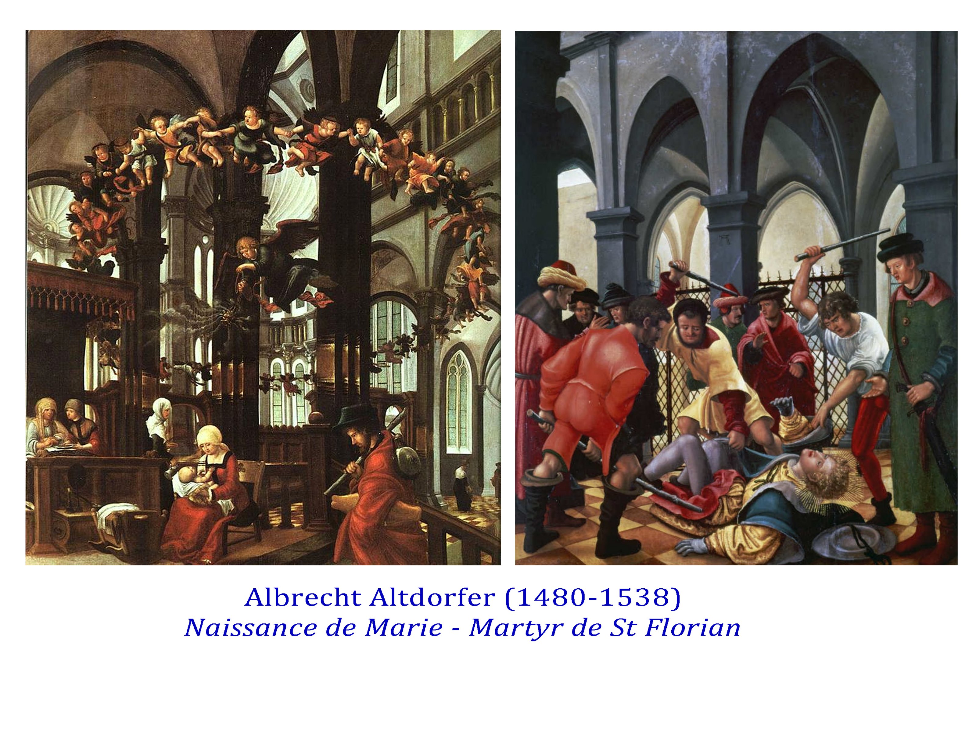 Ci dessous, une galerie correspondant à ce qui peut être considéré comme un tournant dans la peinture de cette zone géopolitique qu’est le « saint empire romain-germanique ». Se dissociant de l’esthétique savante de la Renaissance italienne, construite autour des notions d’idéaux, de mathématique, de grâce, de beauté , réunies par des perspectives savantes aux enjeux symboliques, ces artistes « nordiques », privilégient la narration. Ayant parfaitement assimilé les techniques et la virtuosité des grands prédécesseurs falamnds ( Van Eyck etc..), ils privilégient une exploration des possibilités offertes par ce nouvel art, qu’est la « grande peinture » de tableaux, et de polyptyques.