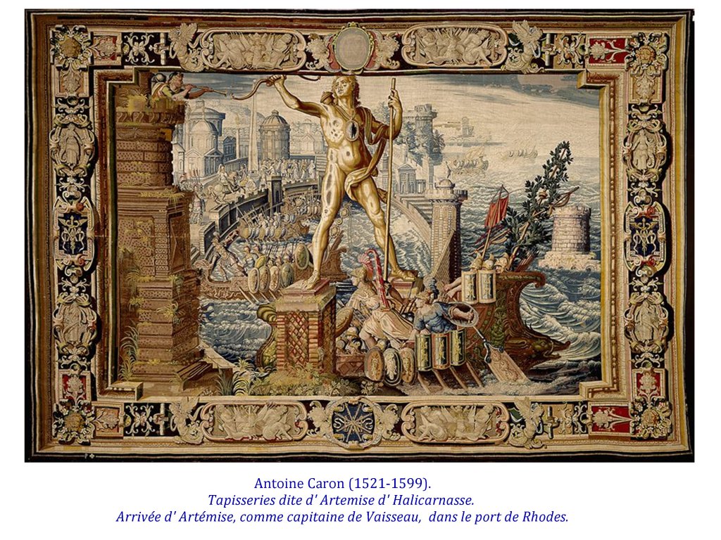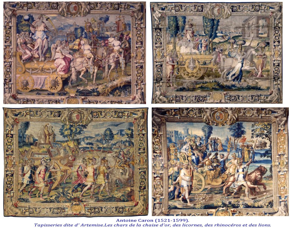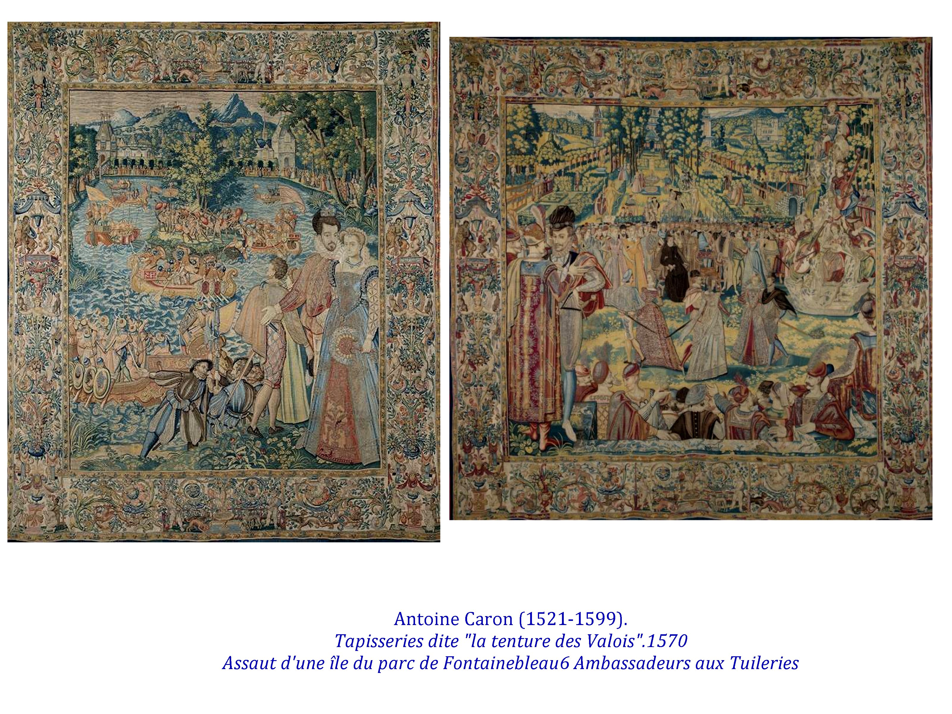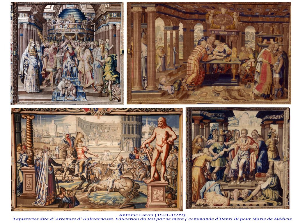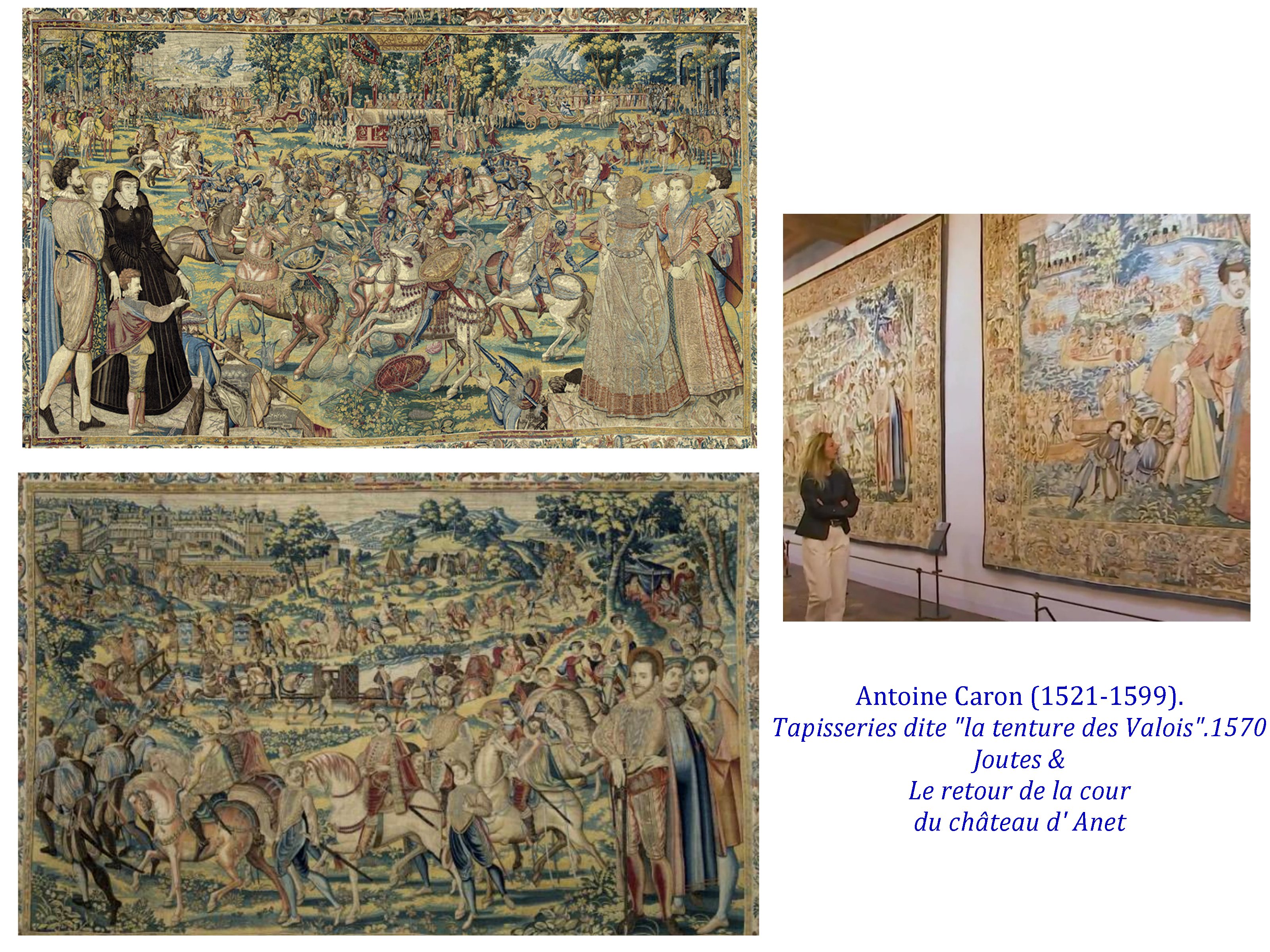 Autre élément notable de cette transition, les déplacements de la cour et les hésitations dans le choix des châteaux et résidences, le Louvre, Fontainebleau, Amboise, sans compter les résidences temporaires et les demeures somptueuses des maîtresses royales, ces déplacements nuisant au déploiement de décors pérennes, au bénéfices des tapisseries ( somptueuses mais fragiles, comme la tapisserie des Valois et le cycle de Caron sur Artemise d’ Halicarnasse ( comme archétype des reines veuves et courageuses, éducatrices de rois, Eléonore d’ Aquitaine, Blanche de Castille, Jeanne d’ Albret, Catherine de Médicis).