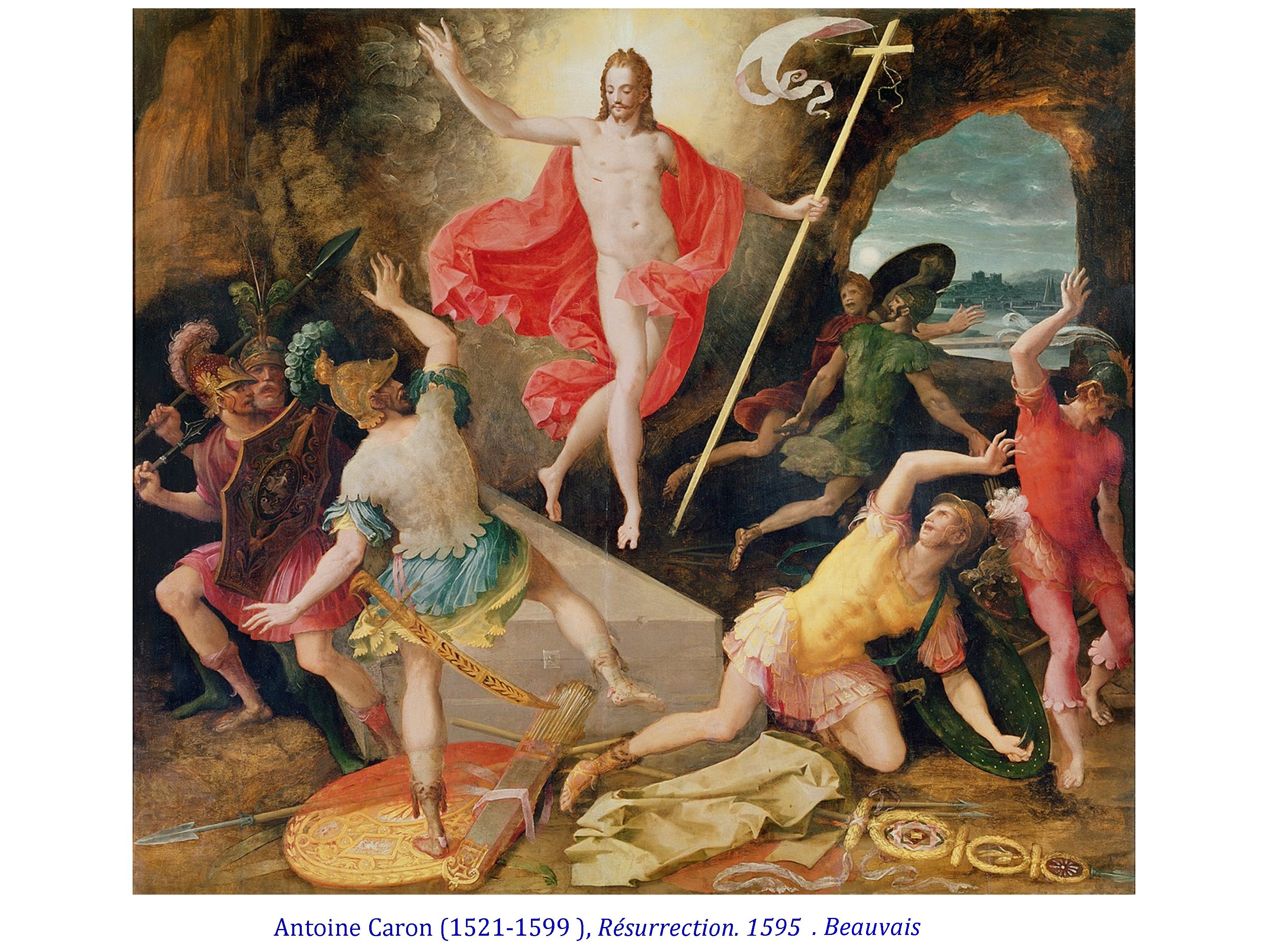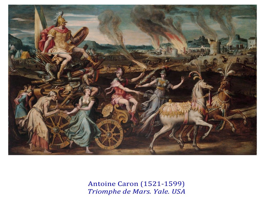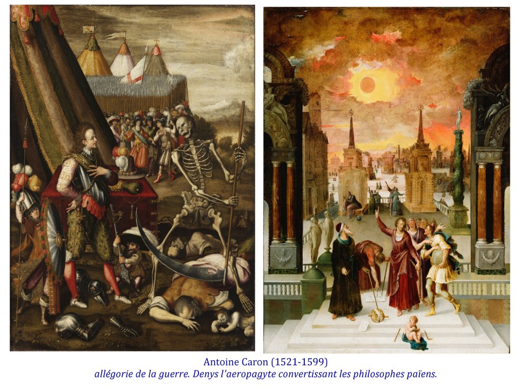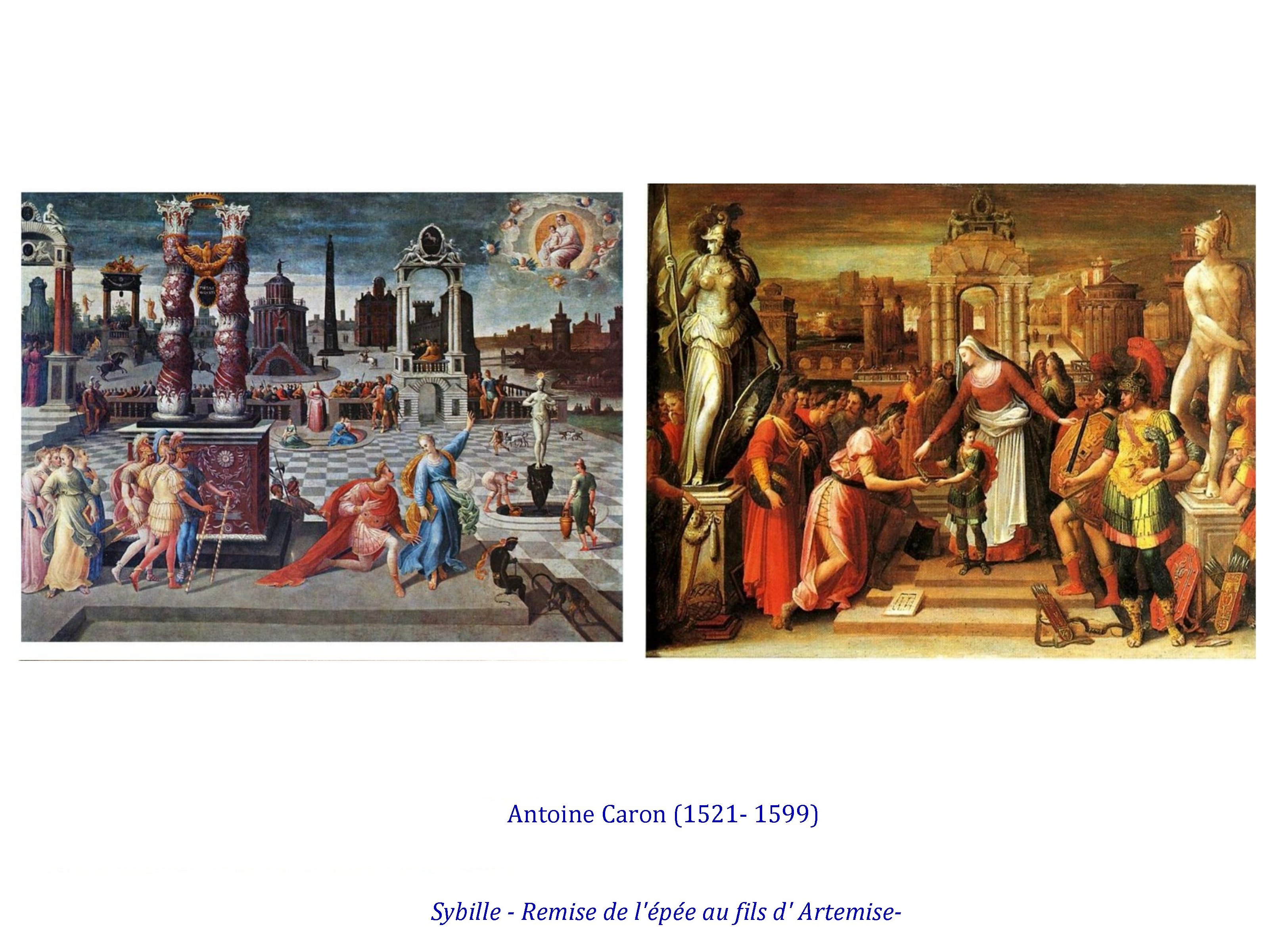 Il n’y a guère qu’Antoine Caron pour essayer avec des extravagances maniéristes, mais un vrai génie de l’ espace et des coloris pour tenter une iconographie humaniste, intégrant l’histoire immédiate ( les guerres de religion, l’assassinat de Thomas More, l’éducation des rois), mais il est sombré dans l’oubli.