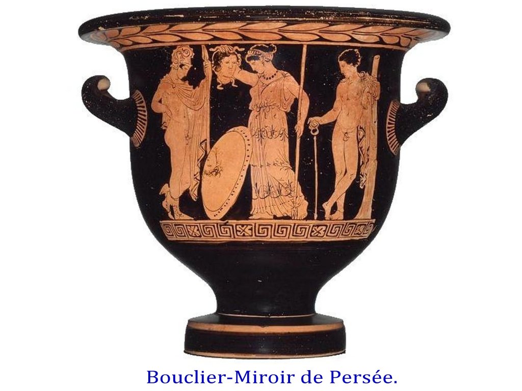 Le reflet/miroir institue de façon formelle et technique et manipulable, la puissance du regard. regard qui tue, qui sidère, mais aussi regard biaisé qui épie. Le mythe de Persée et Méduse, comme celui de Narcisse abordent d’emblée cet aspect du reflet.