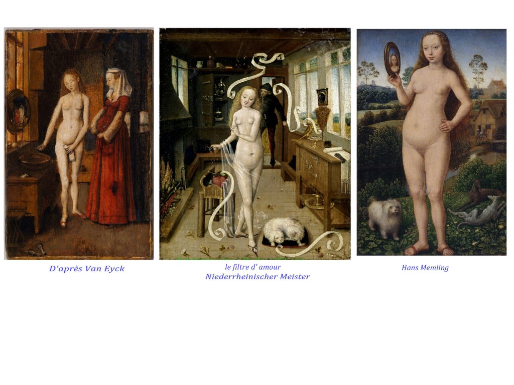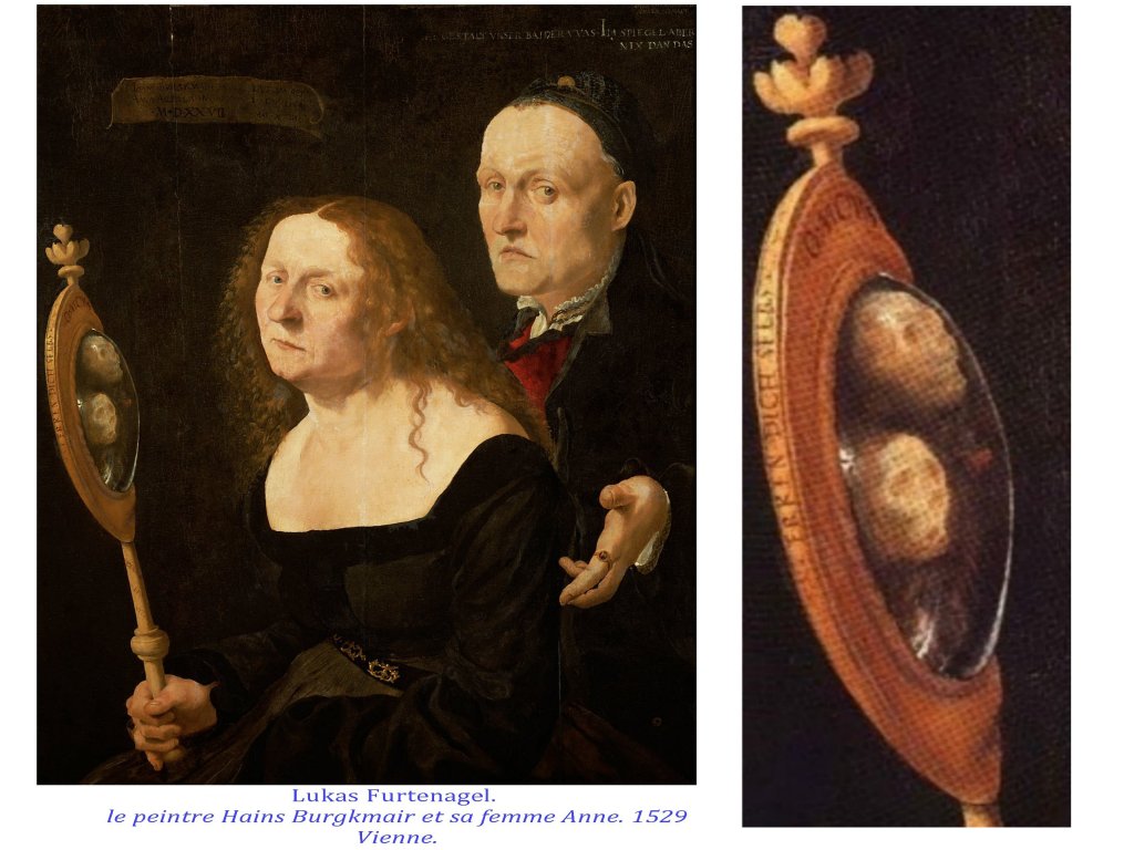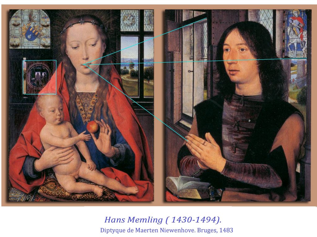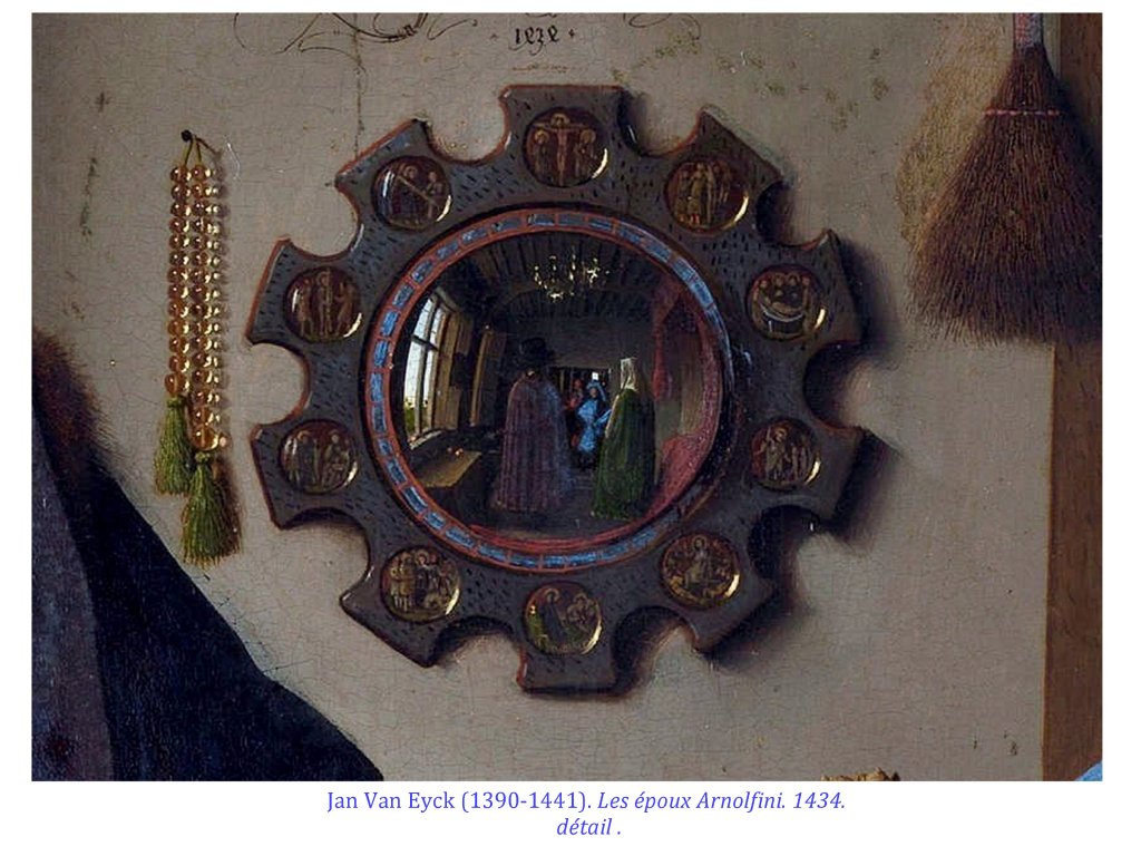 Les miroirs convexes des primitifs flamands proposent un autre espace que celui orthogonal de la perspective naissante, mais permettent d’unifier des situations paradoxales comme avec Memling, comme de réunir dans un cercle religieux, les époux, le peintre, les témoins, révélant une réalité plus exacte, un envers de l’image et souvent, la véritable source de lumière et clairement le point de vue du peintre.