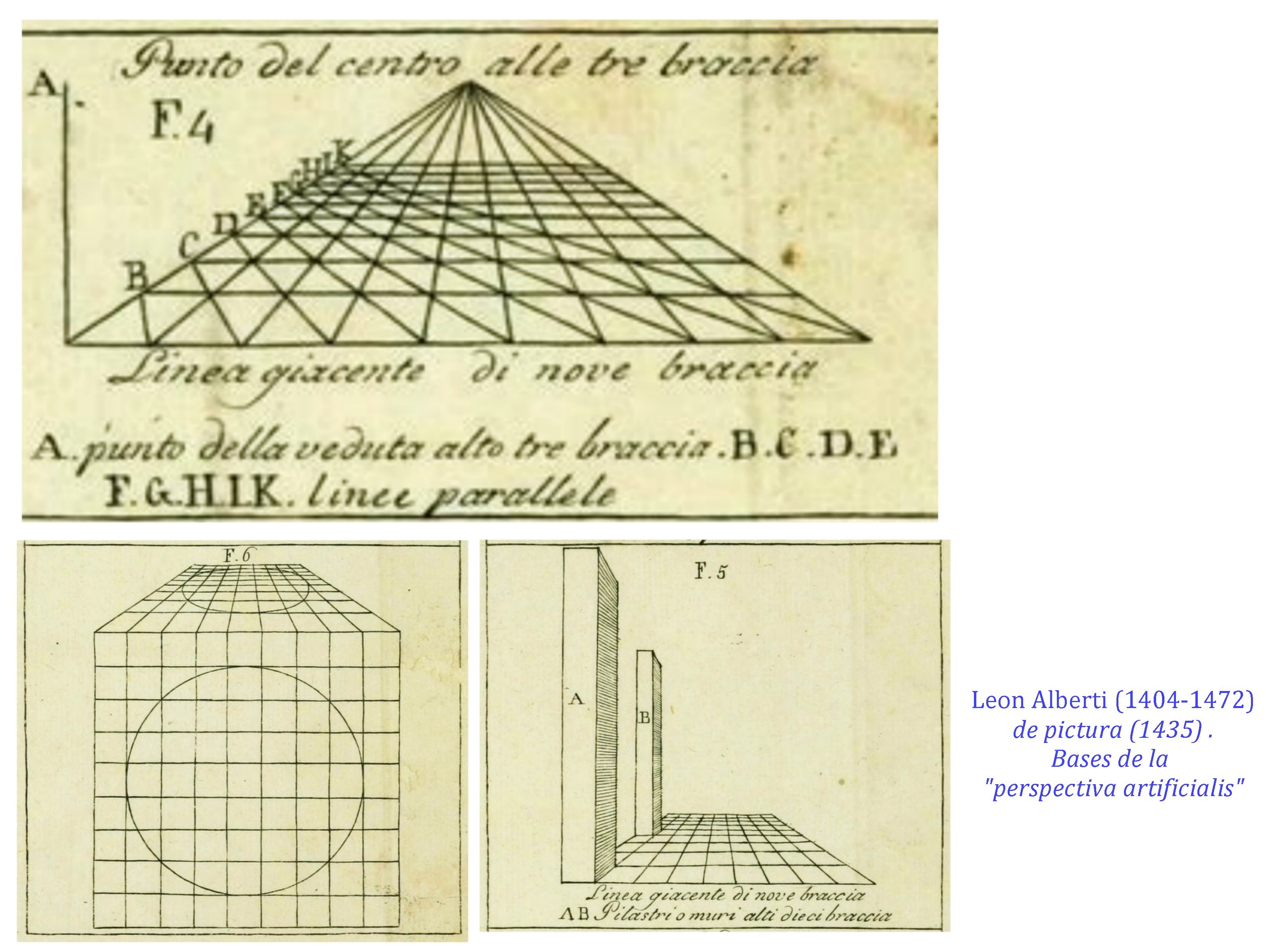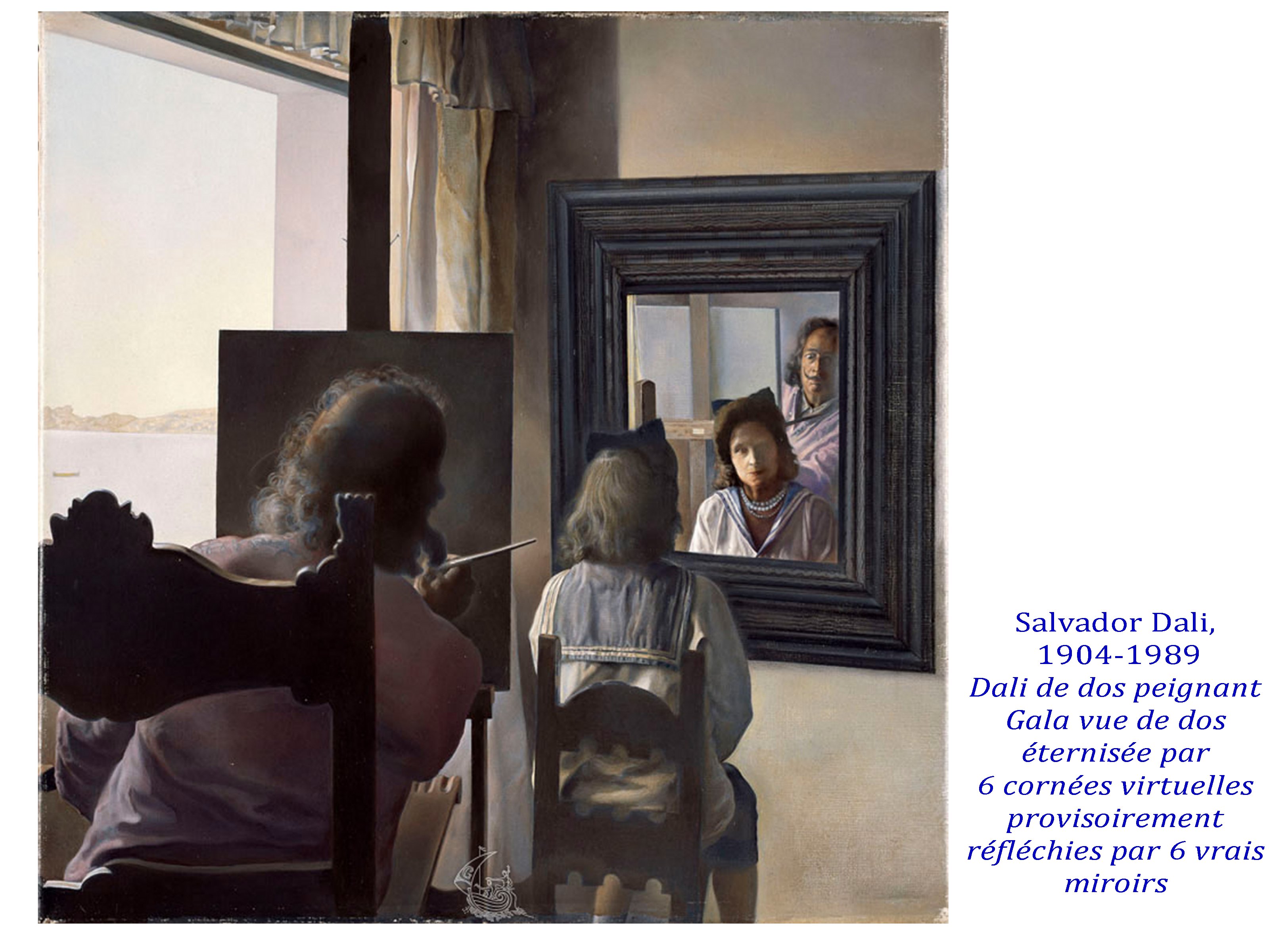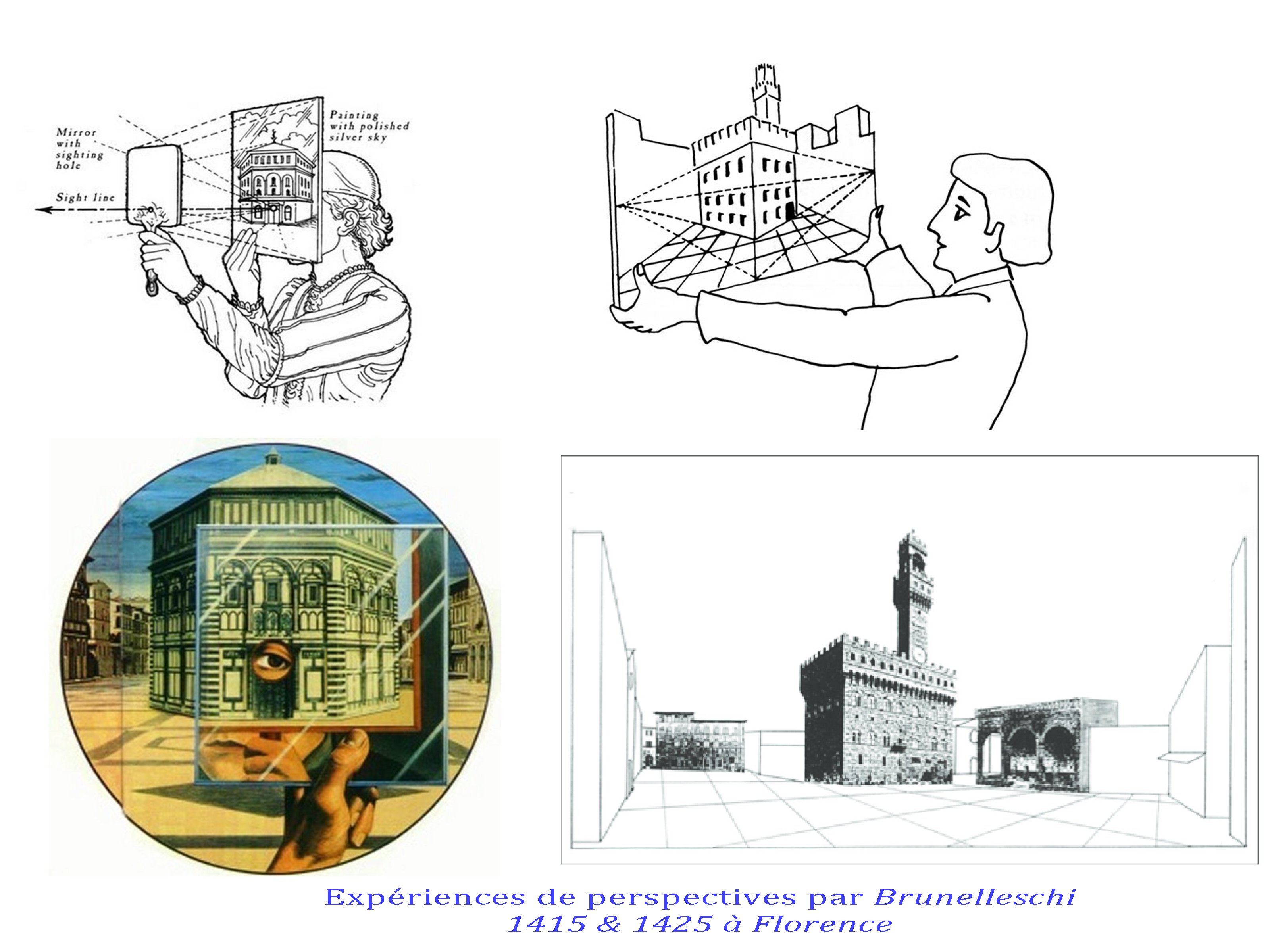 Modéliser la vision est aussi l’affaire de la perspective et de l’optique, avec Alberti, Brunelleschi, Vinci entre autres. Mais aux temps maniéristes du doute, les miroirs reviennent comme des métaphores de vanités et de tromperies, de renvois éphémères de la beauté éphémère des corps et de la séduction. Les reflets sont associés aux trompes-l’oeil et bien sûr aux limites de nos perceptions sensitives. Ainsi De la Tour, associe les miroirs à la mort, aux flammes éphémères, simulacres, avant le retour à la vérité absolue du noir total, métaphore du divin.