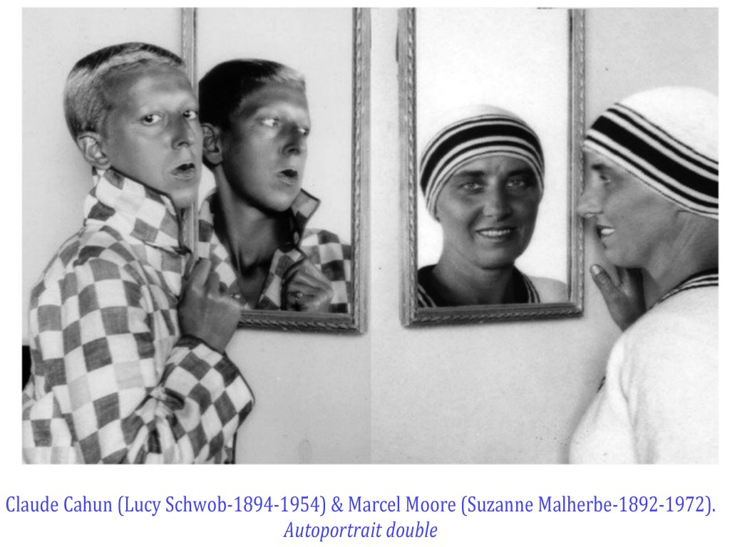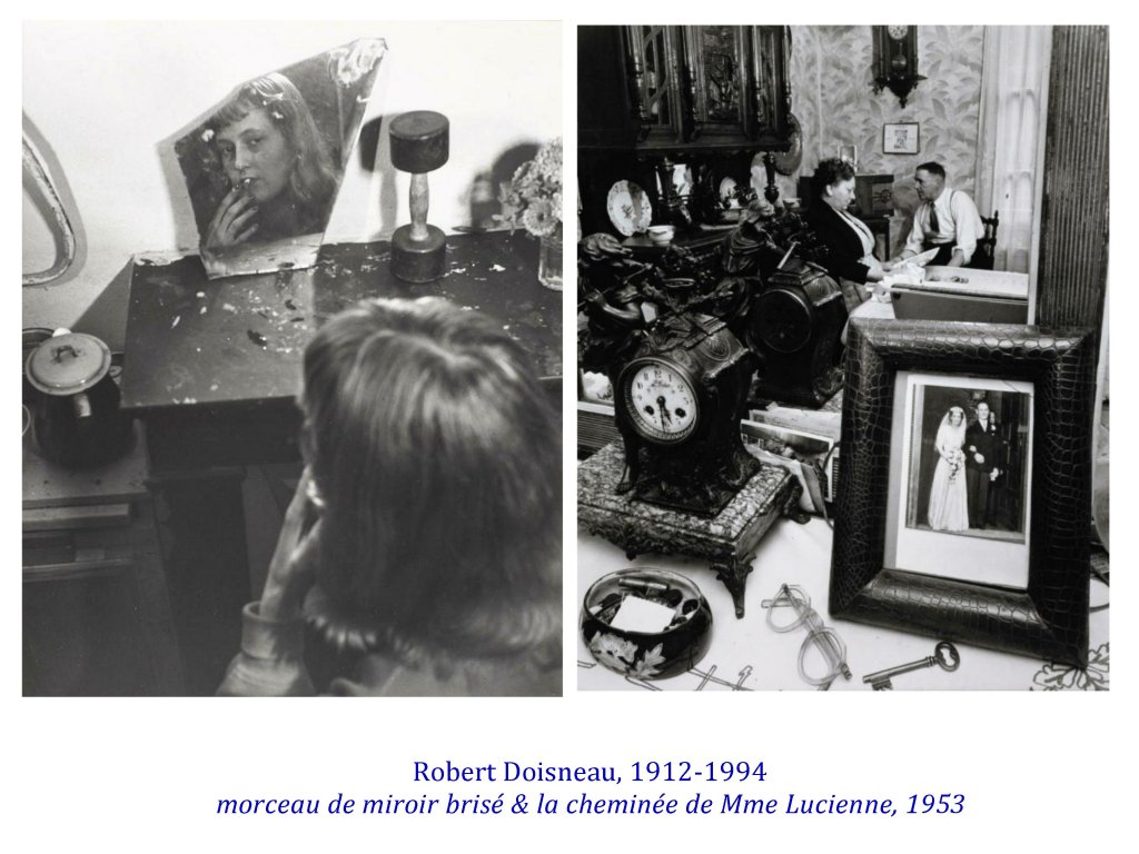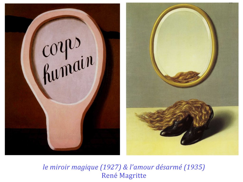 Pour les surréalistes, comme Claude Cahun, puis Magritte ou Dali, à l’évidence, le miroir est un au delà, une virtualité, un double, un envers, un négatif…..Associé à la chambre obscure, à l’œil, à l’alter ego..autant de pistes étayées par la psychanalyse récente. La photographie partageant avec le miroir, la même perfection, le cadrage/découpage de l’espace, la lumière, la planéité.