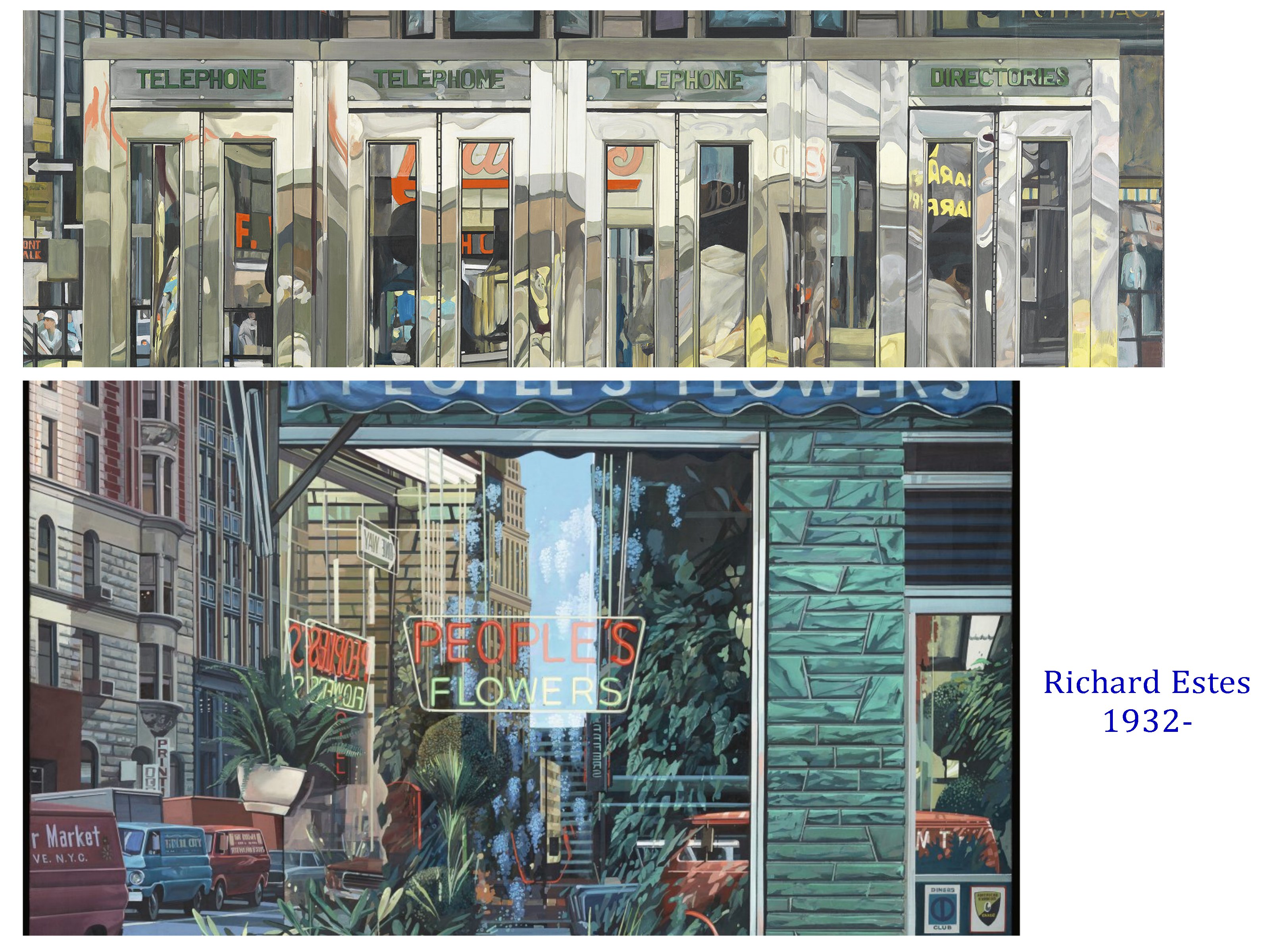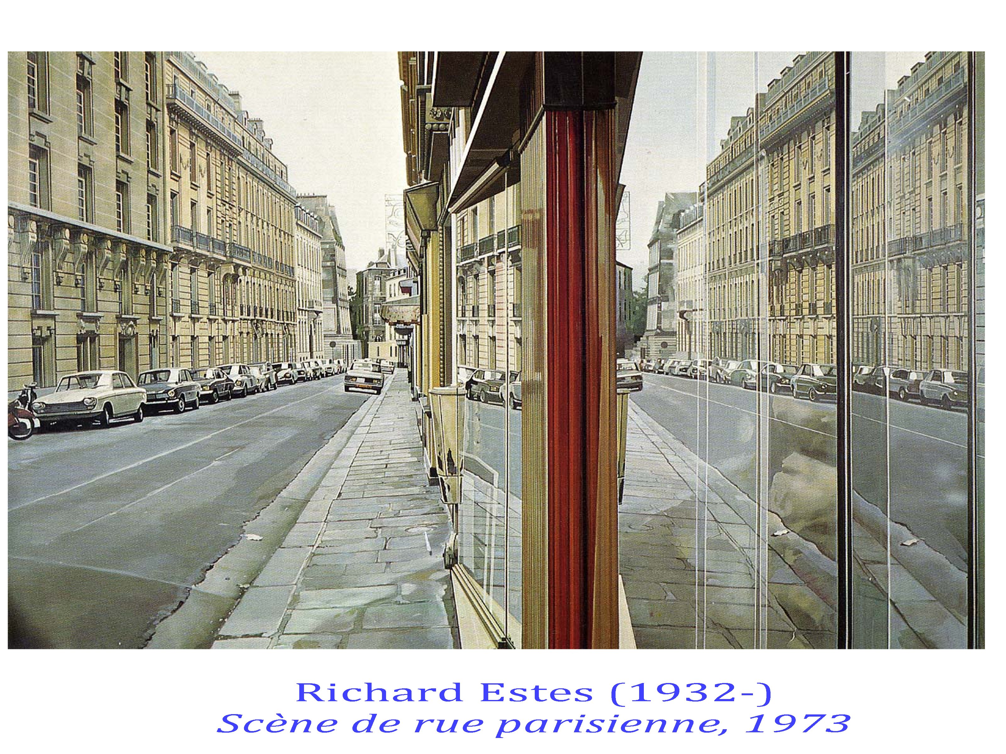 Les hyperréalistes américains comme Estes associant reflet, photographie et peinture, comme dans un dialogue exacerbé dans nos sociétés modernes ou image, spectacle et illusions se substituent au réel.
