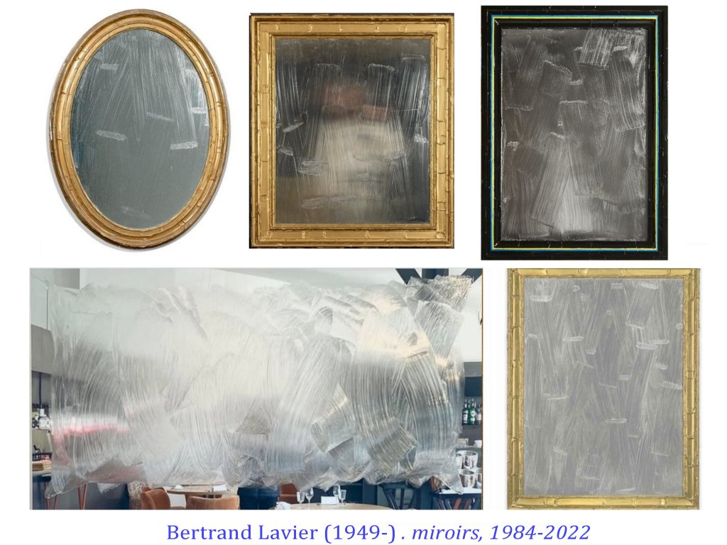 Bertrand Lavier, avec humour, brouillant par des médiums picturaux l’image parfaite du miroir, revient à la peinture comme élément ; ici, il voile le regard et frustre la puissance du rayon visuel, qui au lieu de plonger vers les espaces profonds, bute sur les surfaces de matières.