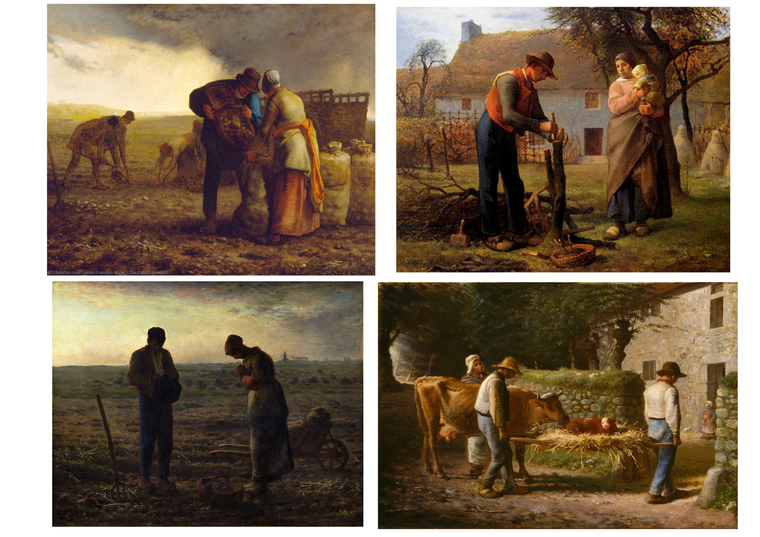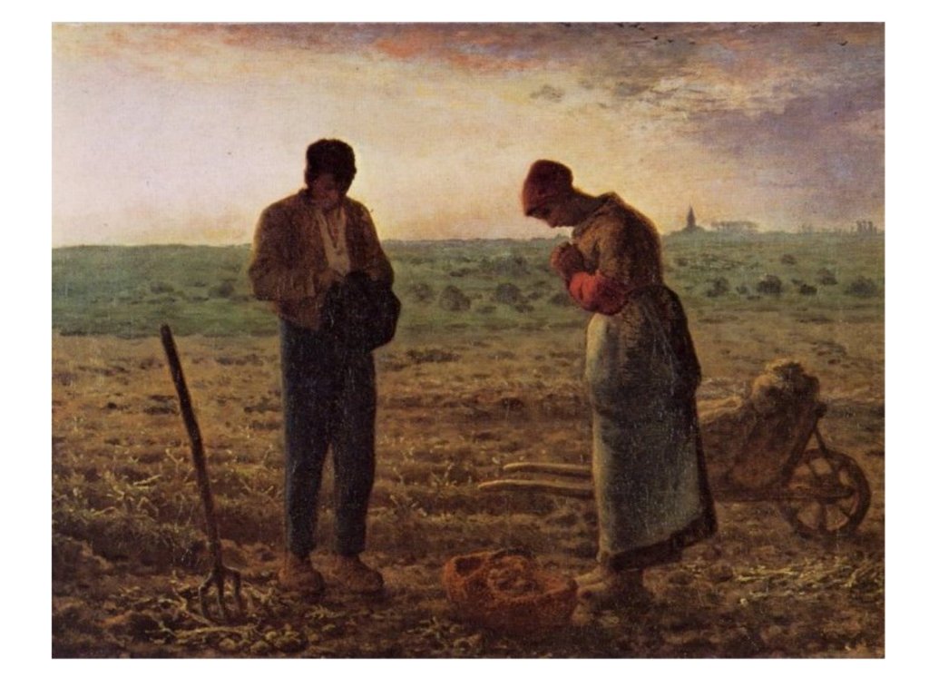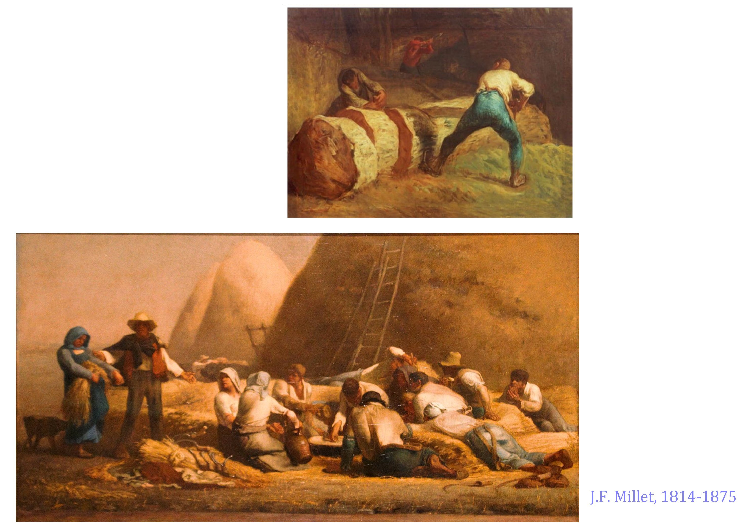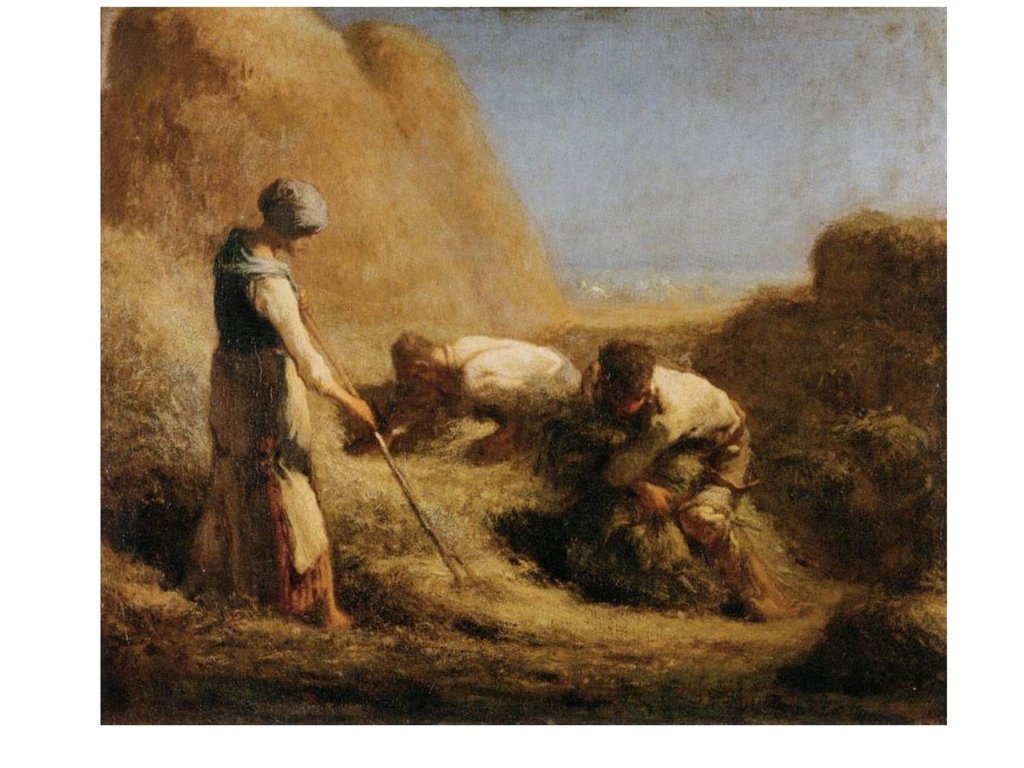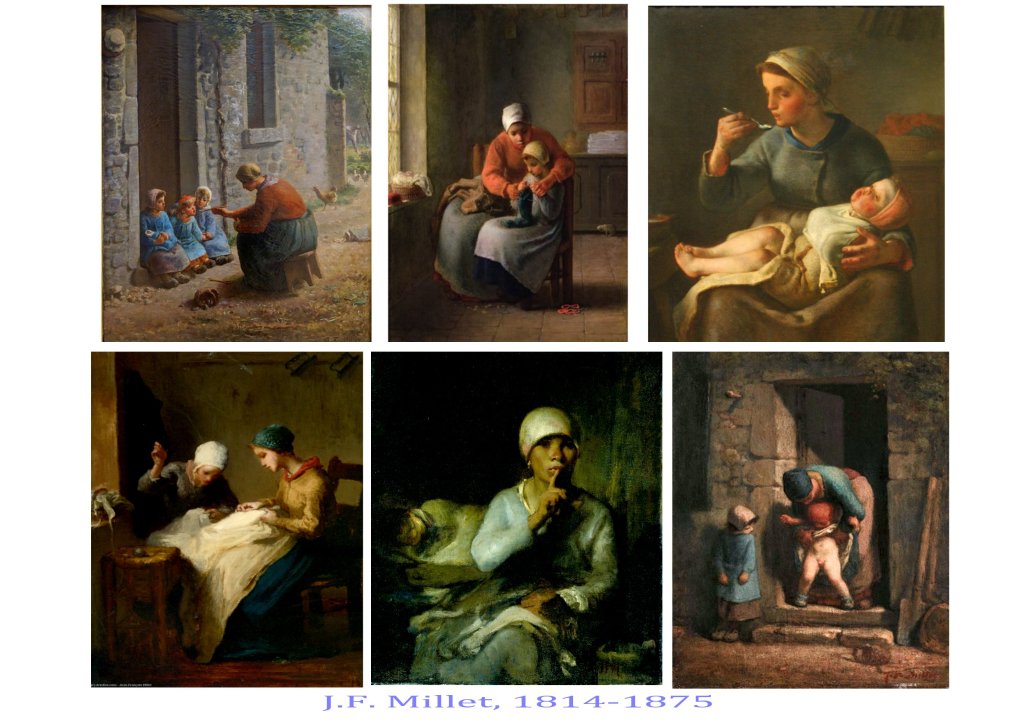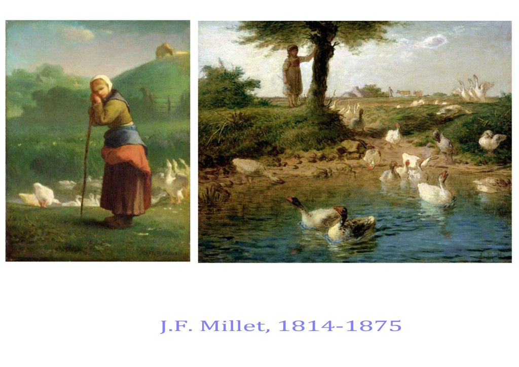 J. F Millet est un rural, provincial du Cotentin et la vie parisienne ne l’attire guère. Sa sensibilité extraordinaire aux lumières, aux corps, aux poses naturelles le porte à voir dans la paysannerie pauvre de la plaine de Barbizon-Chailly le sujet de prédilection pour exprimer sa vision du monde. Il réussit à monumentaliser les figures anonymes de ces campagnes, comme à révéler, les lumières uniques des petits matins et des crépuscules, qui sont comme une récompense aux travailleurs et travailleurs des champs, soumis aux cycles des saisons. Même un potager, un verger, peuvent devenir pittoresques, à l’opposé des grands paysages historiques, bibliques, exotiques de l’académisme tout-puissant alors à Paris. Son usage d’une peinture assez épaisse, comme inspirée par Chardin, son usage des couleurs primaires, du flou démontrent aussi que Millet est un grand plasticien, qui opère des choix radicaux dans ses moyens d’expression.