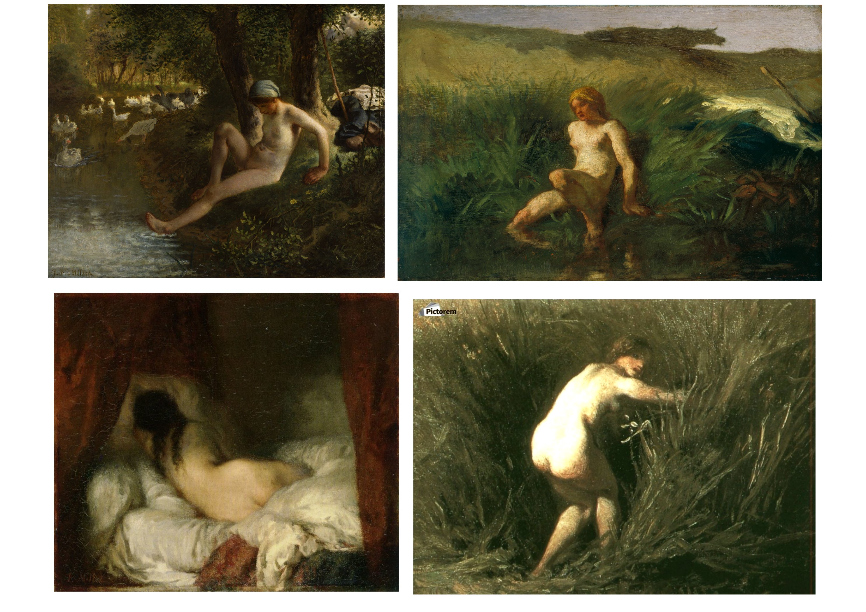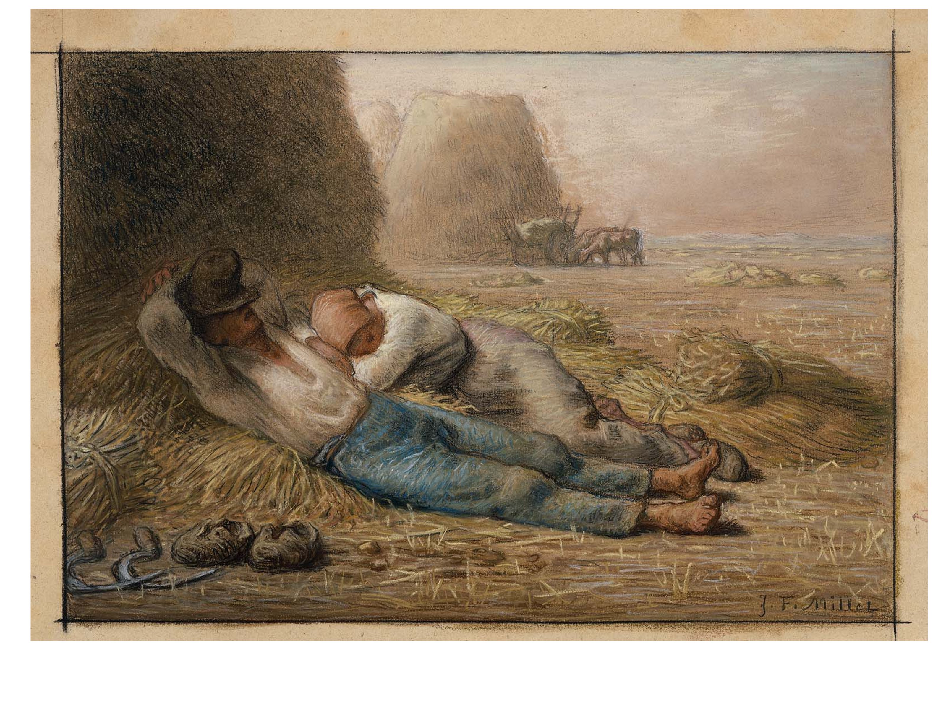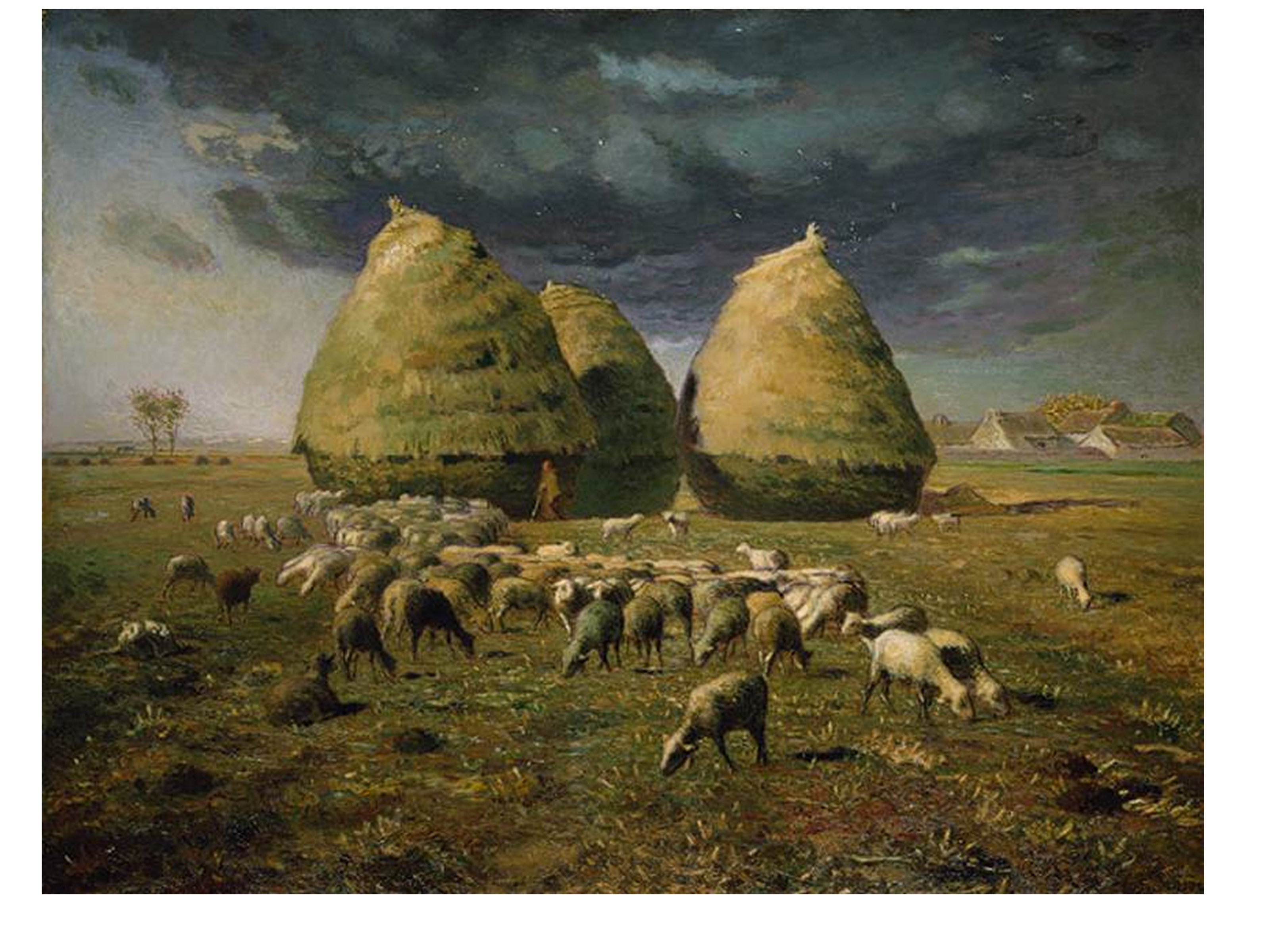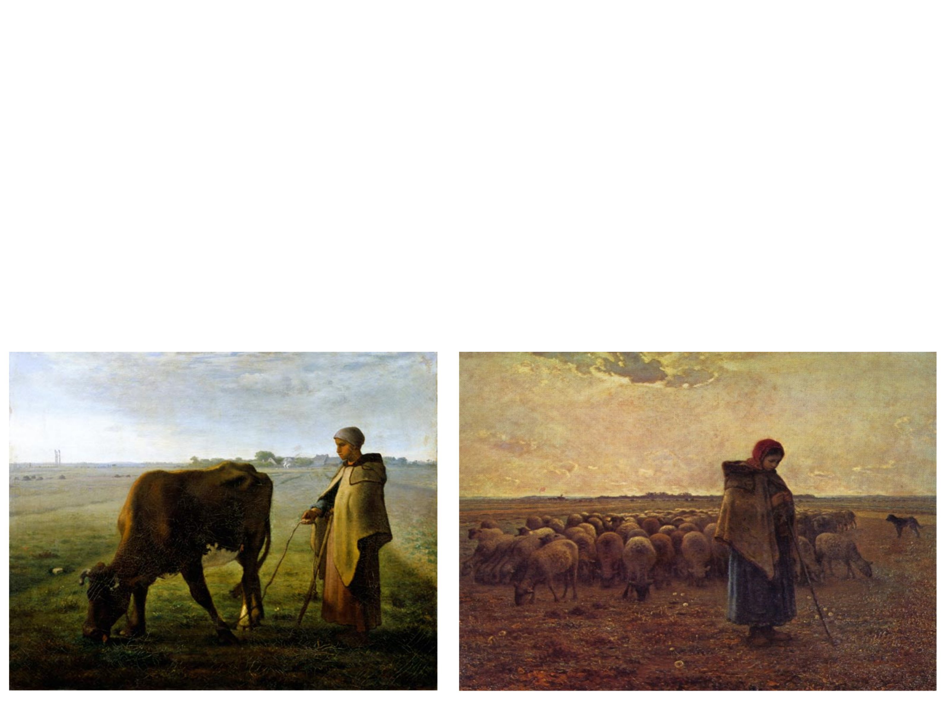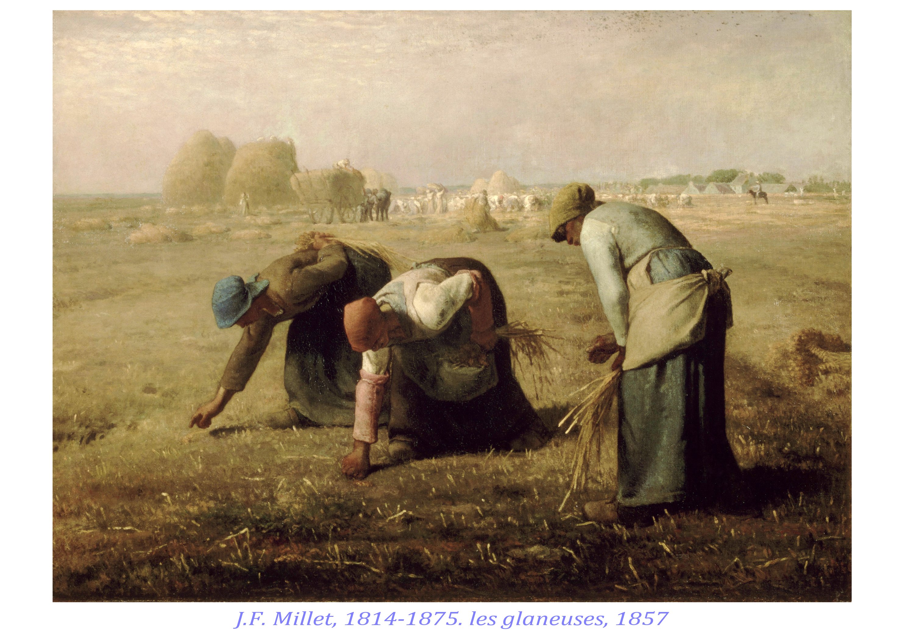 J. F Millet est un rural, provincial du Cotentin et la vie parisienne ne l’attire guère. Sa sensibilité extraordinaire aux lumières, aux corps, aux poses naturelles le porte à voir dans la paysannerie pauvre de la plaine de Barbizon-Chailly le sujet de prédilection pour exprimer sa vision du monde. Il réussit à monumentaliser les figures anonymes de ces campagnes, comme à révéler, les lumières uniques des petits matins et des crépuscules, qui sont comme une récompense aux travailleurs et travailleurs des champs, soumis aux cycles des saisons. Même un potager, un verger, peuvent devenir pittoresques, à l’opposé des grands paysages historiques, bibliques, exotiques de l’académisme tout-puissant alors à Paris. Son usage d’une peinture assez épaisse, comme inspirée par Chardin, son usage des couleurs primaires, du flou démontrent aussi que Millet est un grand plasticien, qui opère des choix radicaux dans ses moyens d’expression.